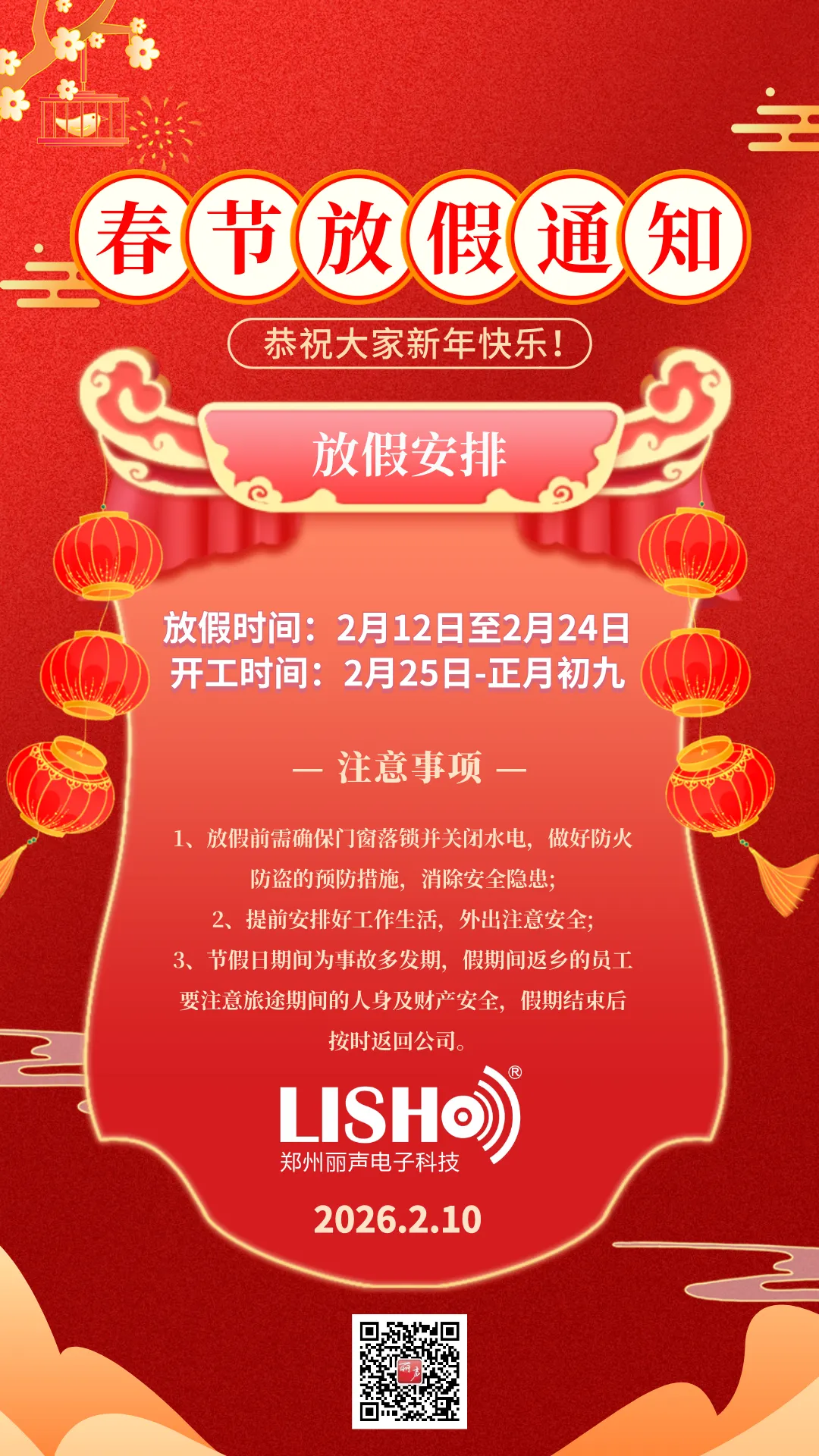 >郑州丽声电子科技有限公司-2026年新年放假通知