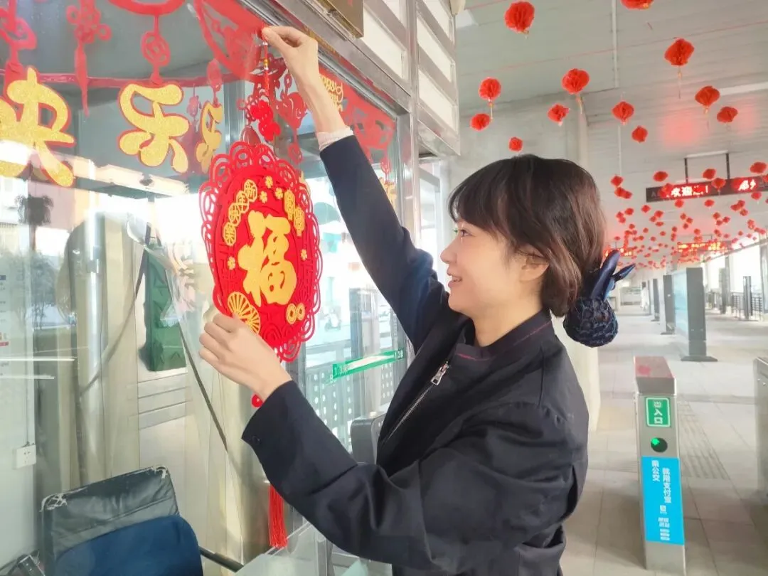 步入站台便能被这份喜庆包裹,放眼望去,一串串、一排排红灯笼如同累累硕果,悬挂在站台顶棚、廊柱之间。它们色泽鲜艳,迎风摇曳,与简洁的站台相映成趣,营造出温馨、喜庆、祥和的氛围,温暖了每一位旅客的归家路。