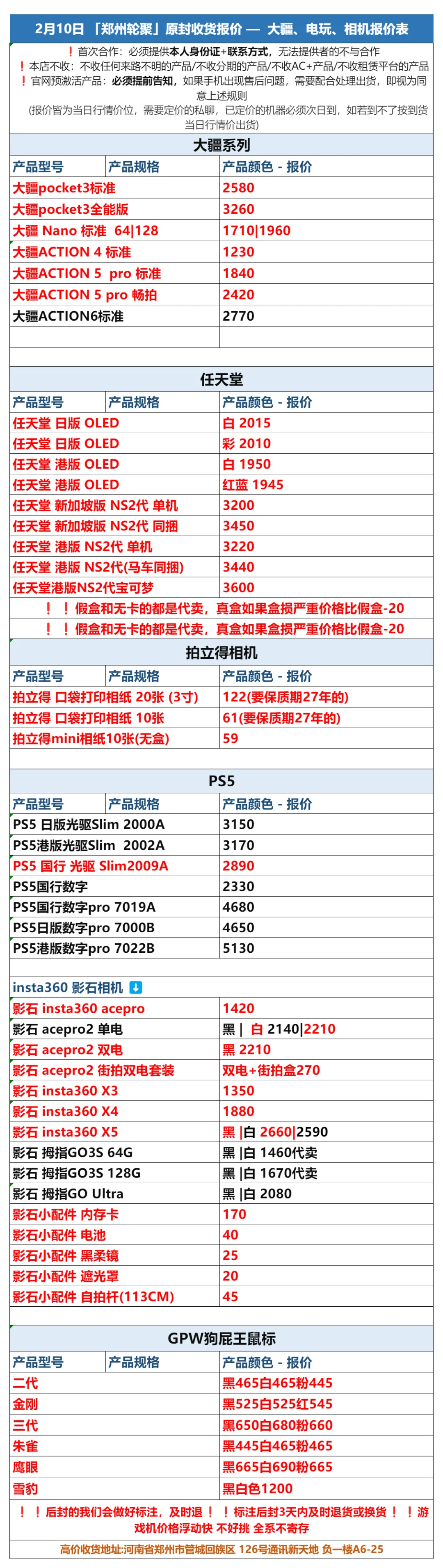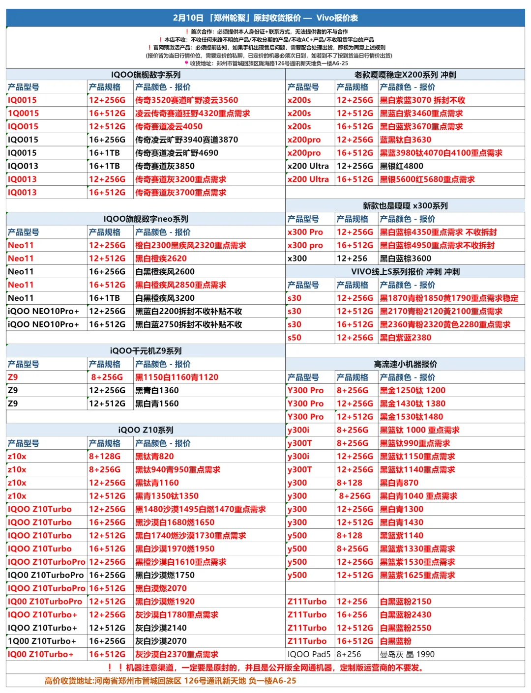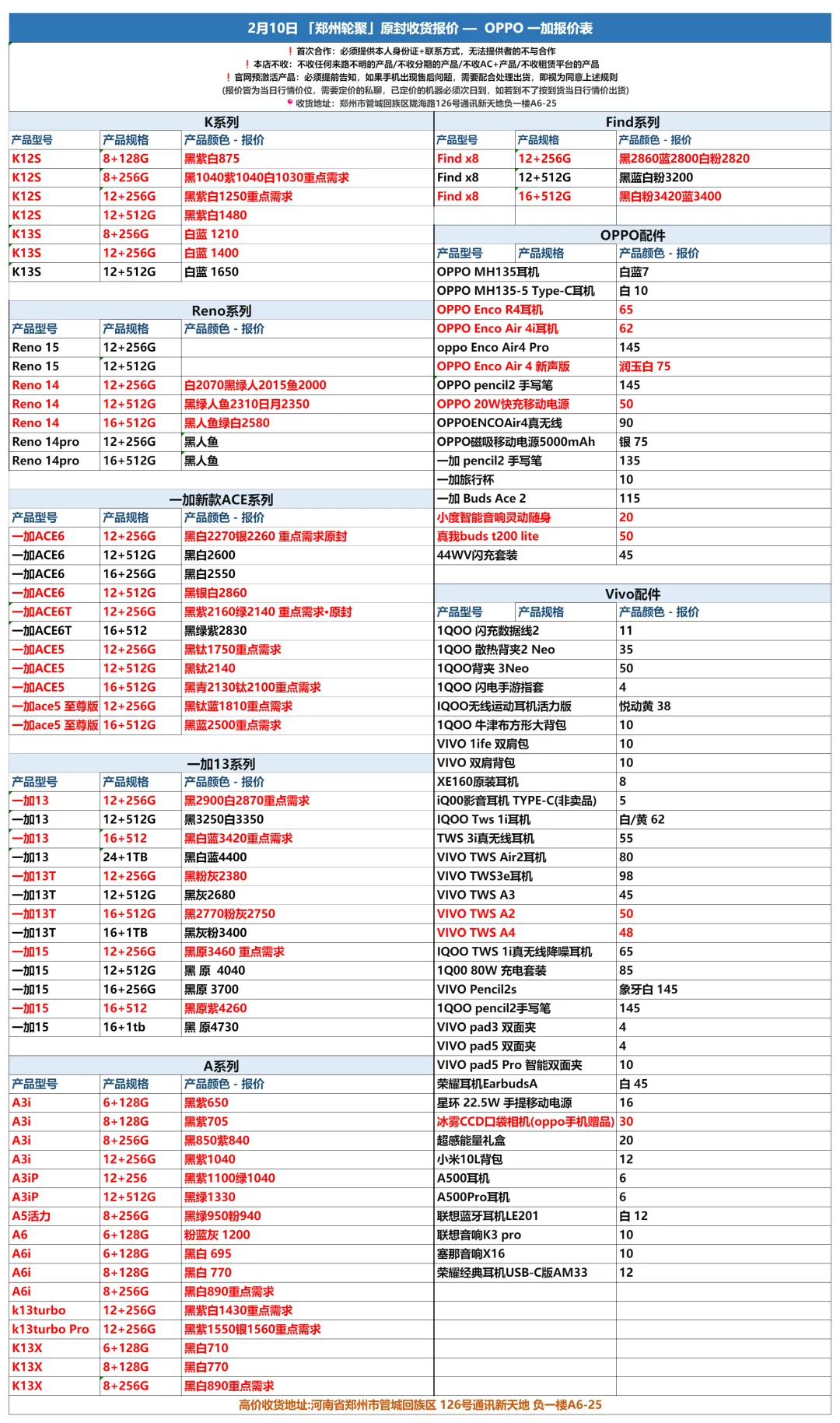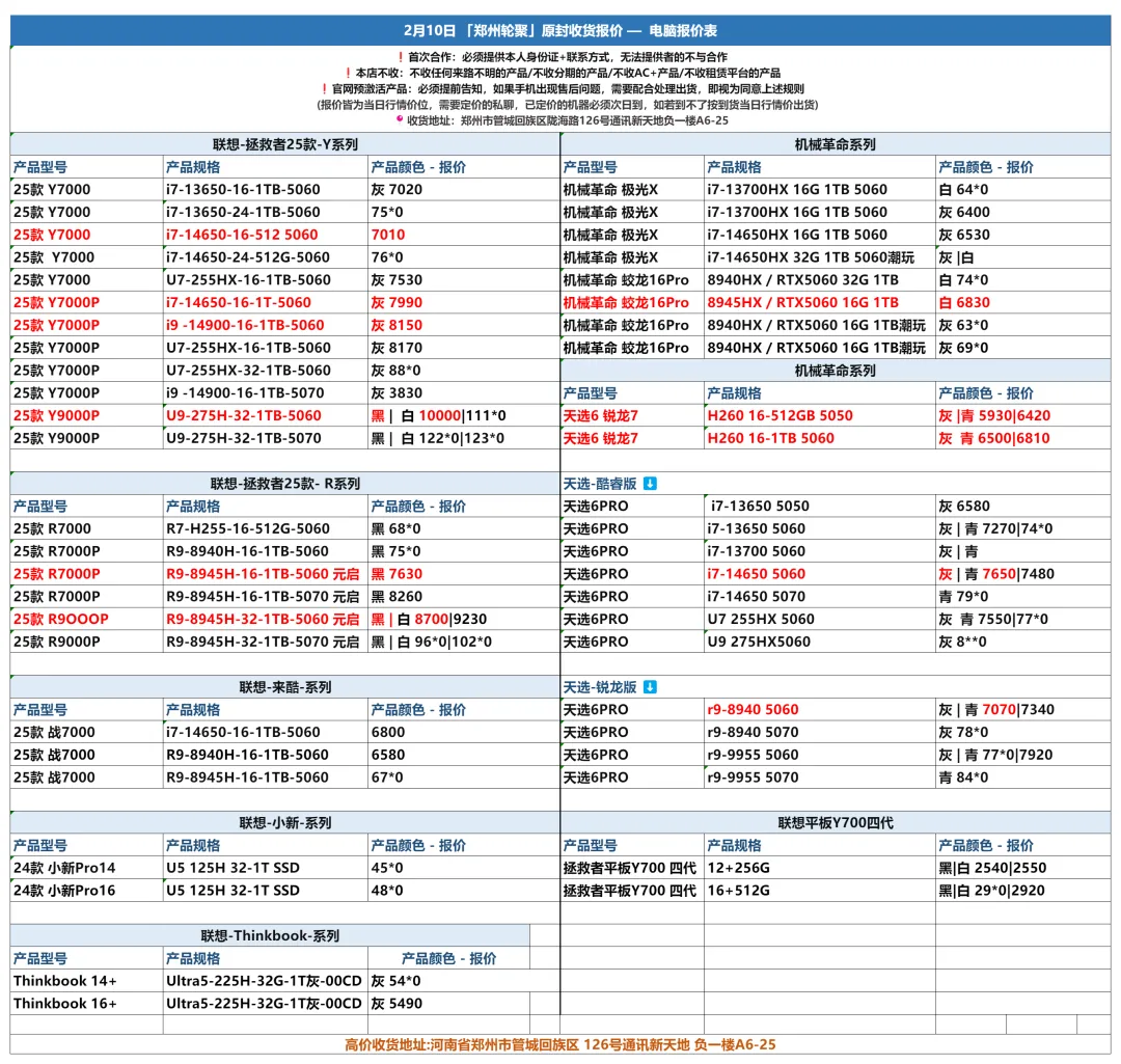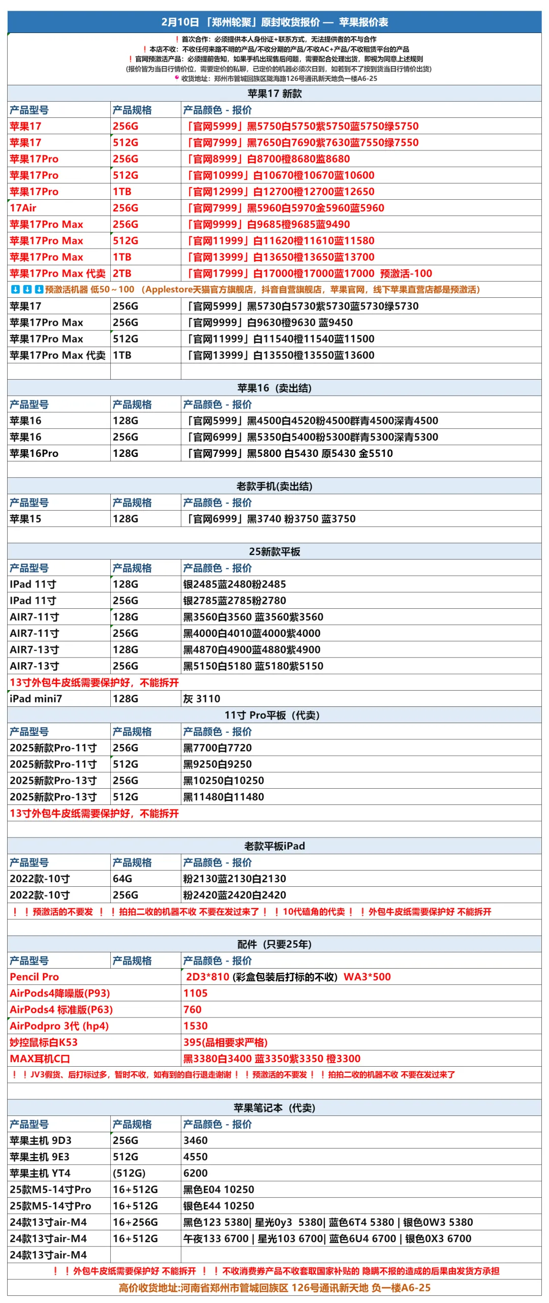 郑州轮聚通讯 2026年2.10日数码报价更新