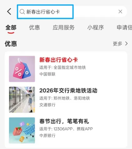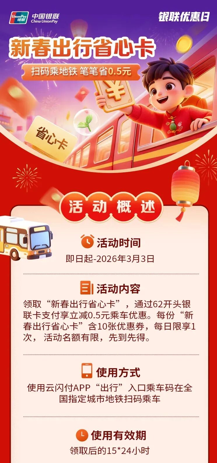 活动期间,领取新春出行省心卡的云闪付APP用户,使用云闪付APP乘车码在指定城市(含郑州市)乘坐地铁,通过62开头银联卡支付可享立减0.5元优惠。每份“新春出行省心卡”含10张优惠券,每日限享1次优惠,使用有效期为领取后15*24小时。单用户活动期间限领取一次“新春出行省心卡”。领取截止时间为2026年3月3日23:59:59,核销使用截止时间为2026年3月18日23:59:59。活动每日名额及总名额有限,先到先得。