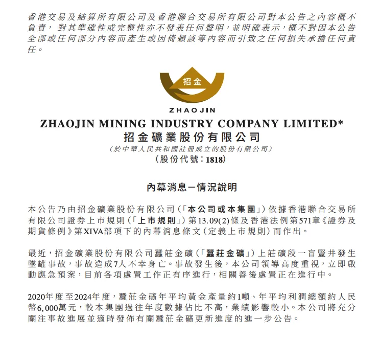 2月10日晚间,招金矿业在港交所发布公告称,董事会谨向在此次事故中不幸遇难者表示沉痛哀悼,对遇难者家属表示诚挚慰问,并对此产生的社会影响深表歉意。