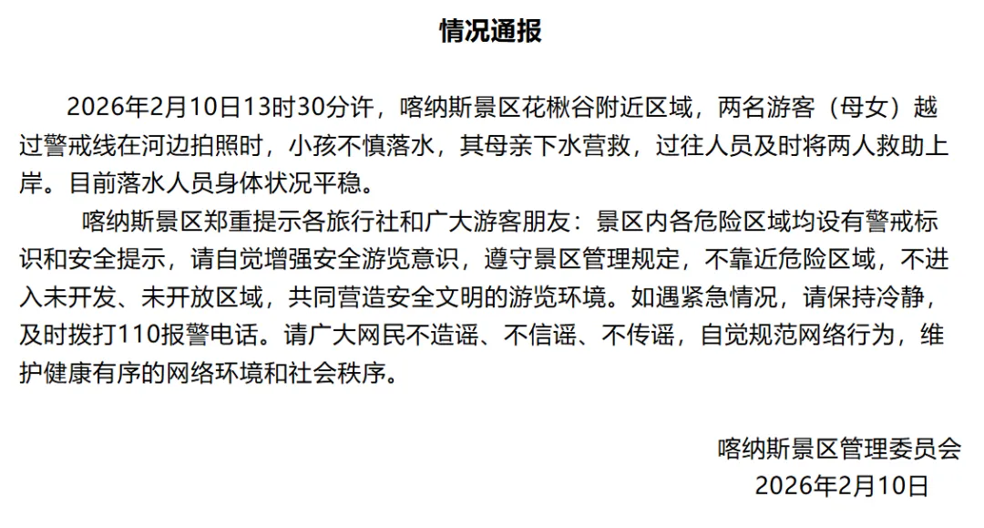 ●2月10日13时30分许,喀纳斯景区花楸谷附近区域,两名游客(母女)越过警戒线在河边拍照时,小孩不慎落水,其母亲下水营救。新疆喀纳斯景区管理委员会发布情况通报:目前落水人员身体状况平稳,请游客自觉增强安全游览意识。