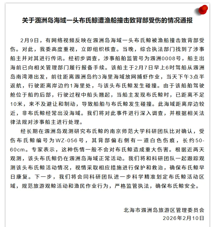 ●2月10日晚,广西北海市涠洲岛旅游区管委会通报“涠洲岛海域一头布氏鲸遭渔船撞击致背部受伤”:将对此事件进行深入调查,并根据相关法律法规对涉事船主进行处理。