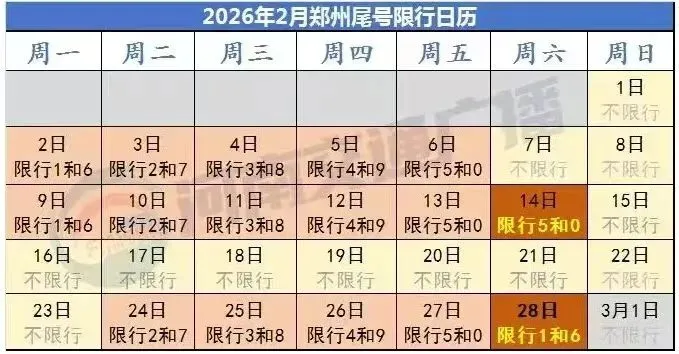 ●本周六(2月14日)调休上班,郑州市机动车限行尾号为5和0;2月28日(周六)调休上班,限行1和6。2月15日-23日,不限行。