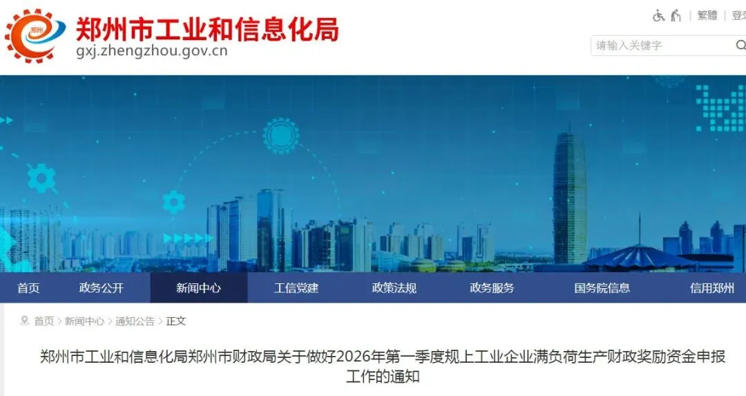 为贯彻落实《河南省人民政府办公厅关于印发推动2026年第一季度经济发展实现良好开局若干政策措施的通知》(豫政办明电〔2026〕1号),现就做好2026年第一季度规模以上工业企业满负荷生产财政奖励资金申报工作通知如下: