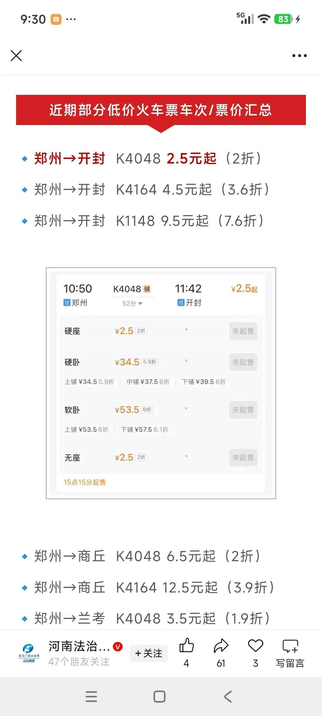 郑州到开封只要一个茶叶蛋钱,2.5元,郑州到上海,只需一杯咖啡钱,24.5元。