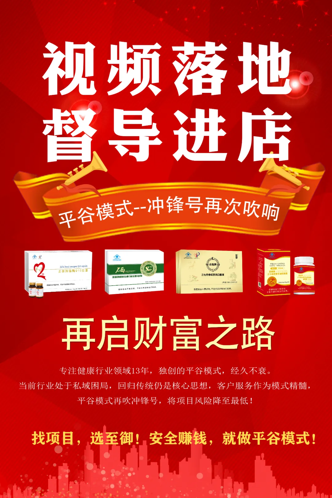 至御全系列项目,均为自主知识产权。目前,至御辅酶Q10、三七丹参红景天口服液、至御硒维生素C维生素E软胶囊、三七纳豆紫苏油软胶囊等各长线项目凭借独特的卖点和高效的方式方法赢得全国合作伙伴的青睐。同时,各产品不断迭代、升级、更新,力求让合作伙伴满意、让消费者认同。
