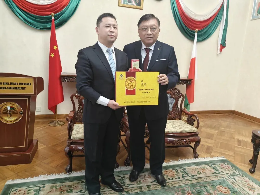 2024年3月10日,北京新融和受邀抵达马达加斯加共和国驻华大使馆,接受马达加斯加驻华大使让·路易·罗班松博士的亲自接见,并进行专业的沟通和交流,将一带一路国礼品牌“至御牌三七纳豆紫苏油软胶囊”相赠给马达加斯加驻华大使让·路易·罗班松博士。