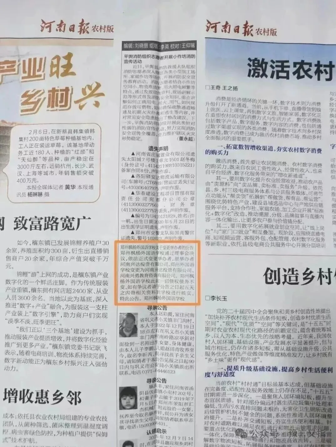 郑州枫杨外国语学校关于变更举办者的公告郑州枫杨外国语学校通过理事会决议,依法正式变更举办者,原举办者河南兴达投资有限公司、郑州外国语学校变更为河南兴达投资有限公司、河南兴勇教育咨询有限公司。