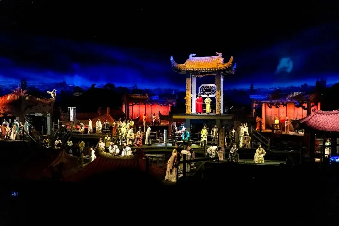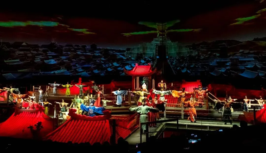 幻城剧场中最震撼的是立体的舞台、炫酷的灯光、大气的背景和华丽的服饰。在这些美轮美奂的效果中,亭台楼阁如天上宫阙,在滚滚云海中或升或降,载来帝王将相和文人骚客,他们用十分熟悉的典故、诗词歌赋来慷慨激昂地讲述璀璨的中原文化,瞬间代入了大家的情绪,再加上转场中那些斗转星移、霞光万丈的壮丽背景,情绪价值得到极大提升,就是感觉一个字:值!