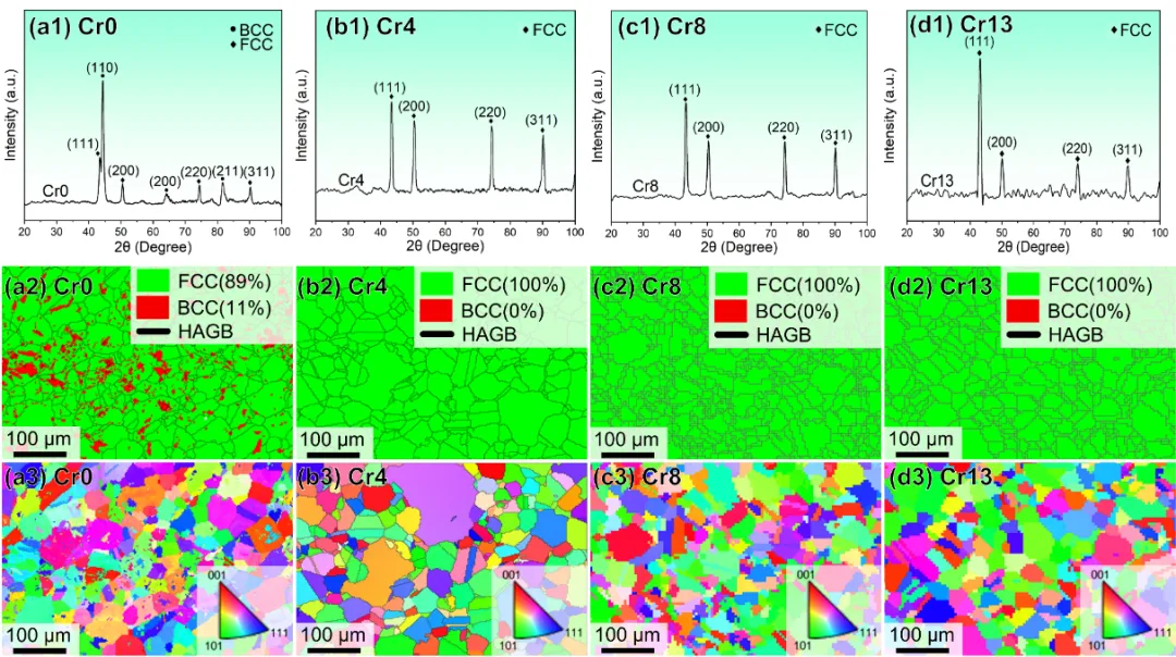 图1. 中熵合金的初始微观结构:(a1-d1) XRD图谱;EBSD (a2-d2) 相分布图及 (a3-d3) IPF图。HAGB:大角度晶界。