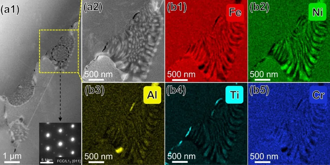 图2. Cr8中熵合金的典型初始微观结构。(a1-a2) 显示晶界凸出的TEM图像;(b1-b5) 相应的EDS面分布图,展示了多相结构:晶界区域的富Al相和富Ti相,以及晶粒内部的纳米析出相。