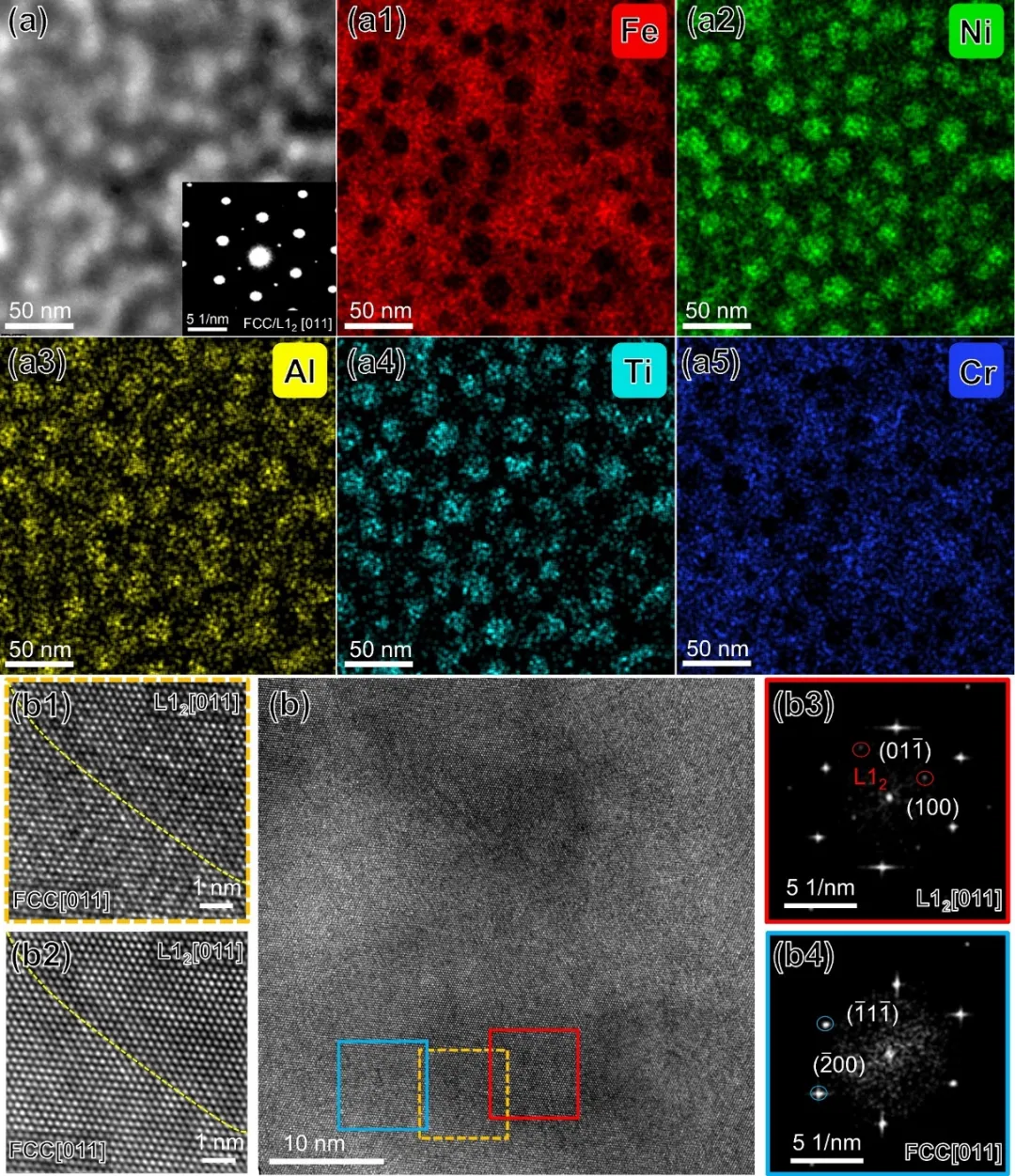 图3. (a) Cr8中熵合金FCC晶粒内部L12纳米析出相的形貌与分布,插图为SAED衍射花样。(a1-a5) EDS面扫描显示L12相及FCC基体中的元素分布。(b) HRTEM图像,(b1) 图(b)中黄色矩形区域的放大图,(b2) 图(b1)的逆傅里叶变换图像,(b3) 和 (b4) 分别为图(b)中红色和蓝色矩形区域的FFT衍射图,展示了FCC基体与L12相之间的共格界面。