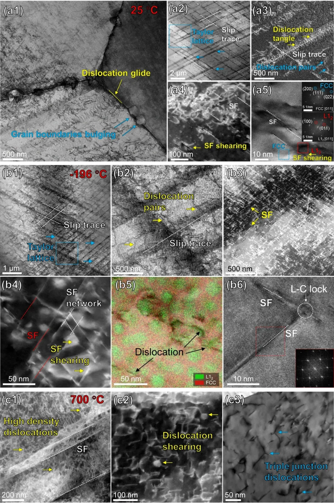 图5. Cr8中熵合金在(a1-a5)25℃、(b1-b6)-196℃及(c1-c3)700℃下变形至约10%工程应变后的微观结构。(a1) 三角形晶界区域形貌;(a2)、(b1) 相交滑移带与泰勒晶格的形成;(a3)、(b2) 滑移带内高密度缠结位错及位错对;(a4-a5)、(b3-b4) 大量堆垛层错(SFs)及层错网络;(b5) 被位错剪切后的L12析出相;(b6) 被层错剪切的L12析出相的HRTEM图像,显示相交层错与L-C锁;(c1) 高密度位错与层错;(c2) 少量L12析出相被位错剪切;(c3) "三叉"位错组态。