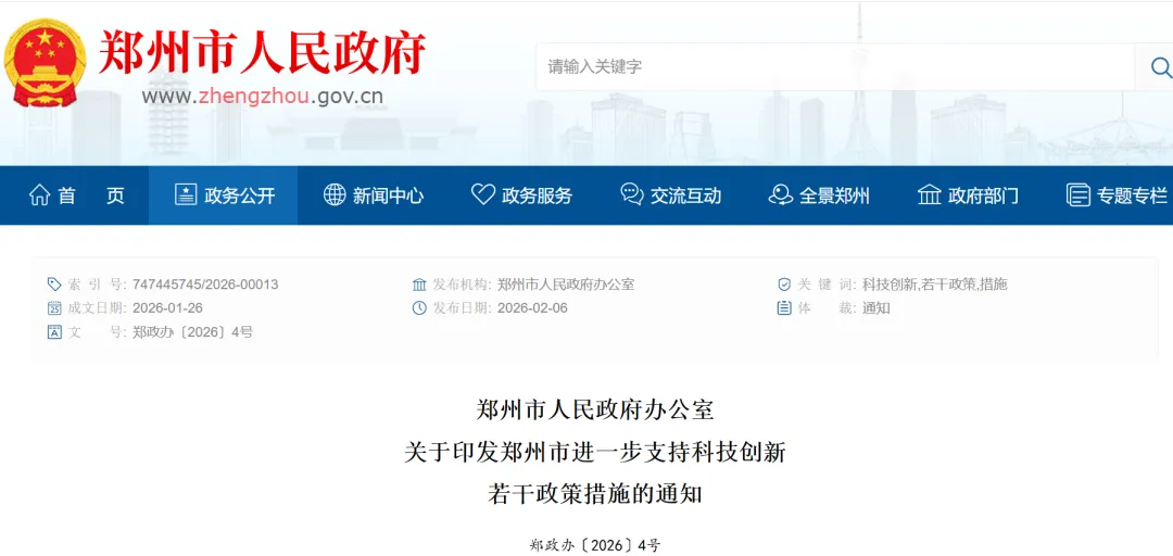 郑州市人民政府办公室 关于印发郑州市进一步支持科技创新 若干政策措施的通知 郑政办〔2026〕4号 各开发区管委会,各区县(市)人民政府,市人民政府各部门,各有关单位: 《郑州市进一步支持科技创新若干政策措施》已经市政府同意,现印发给你们,请结合实际认真贯彻落实。 郑州市人民政府办公室 2026年1月26日 郑州市进一步支持科技创新若干政策措施 为深入贯彻习近平总书记考察河南时重要讲话精神,进一步强化企业科技创新主体地位,促进科技创新和产业创新深度融合,提升城市创新策源能力,推动高质量发展,制定本政策措施。 一、培育壮大创新主体 1.梯次培育创新型企业。以高新技术企业为骨干、科技型中小企业为基础,着力构建创新型企业梯次培育体系,对首次认定、重新认定的高新技术企业分别给予最高20万元、5万元奖补;择优遴选创新龙头企业和瞪羚企业纳入省级培育范畴;鼓励创新龙头企业牵头组建创新联合体,整合产学研用优势资源,聚焦关键核心技术攻关,推动区域创新能力整体提升。 责任单位:市科技局、市财政局、市税务局、郑州航空港区税务局、市市场监管局、市工信局,各开发区管委会,各区县(市)政府 2.优化规模以上企业群体结构。推动高新技术企业规模化,促进规下高新技术企业加快升级为规上企业,对首次入库企业给予10万元一次性奖励,对入库后符合相应条件的企业再次给予奖励。 责任单位:市科技局、市统计局、市财政局 二、引导加大研发投入 3.引导高校、科研院所加大研发投入。按照高校、科研机构、医疗机构上年度研发经费支出额给予最高500万元的梯次奖补,引导其加大研发投入,提升整体科研实力,为区域科技创新提供坚实的人才和技术支撑。 责任单位:市科技局、市财政局 4.鼓励企业自主实施研发项目。鼓励企业与高校通过共建创新联合体、新型研发机构等方式开展企业主导型产学研深度合作,对企业自筹资金、自主立项、自行组织或会同高校、科研院所联合实施的研发项目,经科技部门认定后可列为市级科技计划项目,作为企业申请研发贷款的参考。 责任单位:市科技局、市教育局 三、支持创新平台建设 5.支持争创国家创新平台。对在郑布局的国家实验室分支机构或基地,结合实际需求,按照规定逐一研究进行经费支持。对新创建或成功优化重组获批的全国重点实验室,给予牵头单位200万元一次性奖补;给予共建单位50万元一次性奖补,给予同一单位共建多个实验室的奖补总额不超过100万元。对新创建成功的技术创新中心、企业技术中心等国家创新平台,给予牵头单位200万元一次性奖补。同一主体获批多个平台的,不重复享受市级奖补。 责任单位:市科技局、市发展改革委、市工信局、市财政局 6.完善科技企业孵化载体激励。对新认定的国家级大学科技园牵头单位给予最高100万元奖补,对部级科技型企业孵化器运营主体单位给予最高50万元奖补。对绩效评价为优秀等次的科技型企业孵化器(大学科技园)给予最高10万元奖补。 责任单位:市科技局、市教育局、市财政局 四、加强关键技术研发和应用 7.实施产业技术攻关。围绕优势产业和主导产业部署“揭榜挂帅”重大攻关项目,聚焦企业技术难题实施“揭榜挂帅”企业出题项目,择优给予最高500万元支持;瞄准新兴产业和科技前沿,开展重点研发和国际科技合作项目,择优给予最高50万元支持。 责任单位:市科技局、市财政局 8.深化人工智能场景化应用。围绕产业升级、民生服务、社会治理和生态环保,开发开放一批高价值战略性应用场景,推动人工智能、新一代信息、量子科技等技术大规模场景化应用,开展前沿应用技术试验验证与迭代创新,采取“事前拨付+事后补助”方式,对符合条件的场景示范应用项目择优给予最高500万元支持。 责任单位:市科技局、市财政局 五、完善成果转移转化机制 9.支持科技成果转移转化。依据上年度输出方技术合同登记成交额,给予最高1%、最高50万元奖补。支持技术合同认定登记机构建设发展,按上年度登记技术合同成交额给予最高20万元奖补。 责任单位:市科技局、市财政局 10.布局开放共享的概念验证中心。鼓励在郑高校、科研机构、创新龙头企业等主体,整合技术评估、中试验证、市场分析等全链条服务资源,联合建设面向社会开放共享的概念验证中心,降低企业研发成本,提升转化效率,推动科技成果从样品到产品转化。 责任单位:市科技局 11.鼓励申报科学技术奖。对国家最高科学技术奖获得者,给予1000万元配套奖励;对国家科学技术奖特等奖、一等奖、二等奖第一完成单位分别给予500万元、300万元、100万元配套奖励;对参与完成单位分别给予50万元、30万元、10万元配套奖励。 责任单位:市科技局、市财政局 12.促进大型科学仪器共享利用。采用“科技创新券”方式,对大型科学仪器使用方实际缴纳费用给予最高30%的奖补,同一单位在同一年度最高奖补20万元。 责任单位:市科技局、市财政局 13.加强技术经理人培育引进。鼓励有条件的高校、科研院所开设科技成果转移转化专业课程,打造高水平技术经理人才队伍。完善技术经理人职称评定,将技术经理人纳入急需紧缺人才目录,支持申报郑州人才计划。 责任单位:市科技局、市委人才办、市人社局、市教育局 六、推动科技人才创新 14.支持高层次人才团队