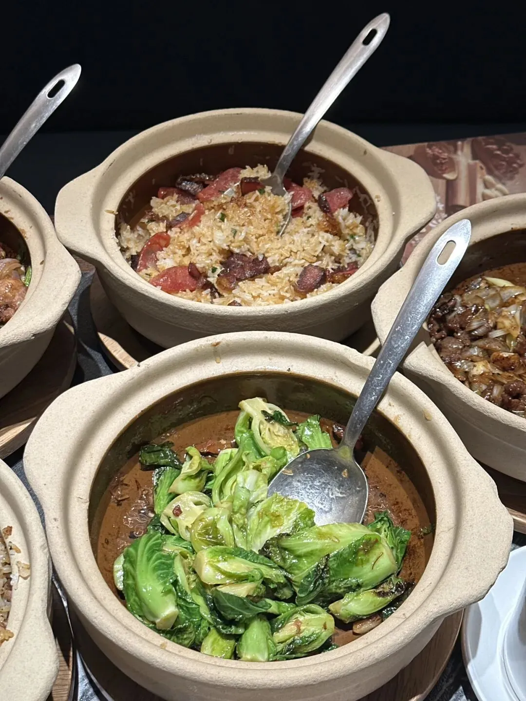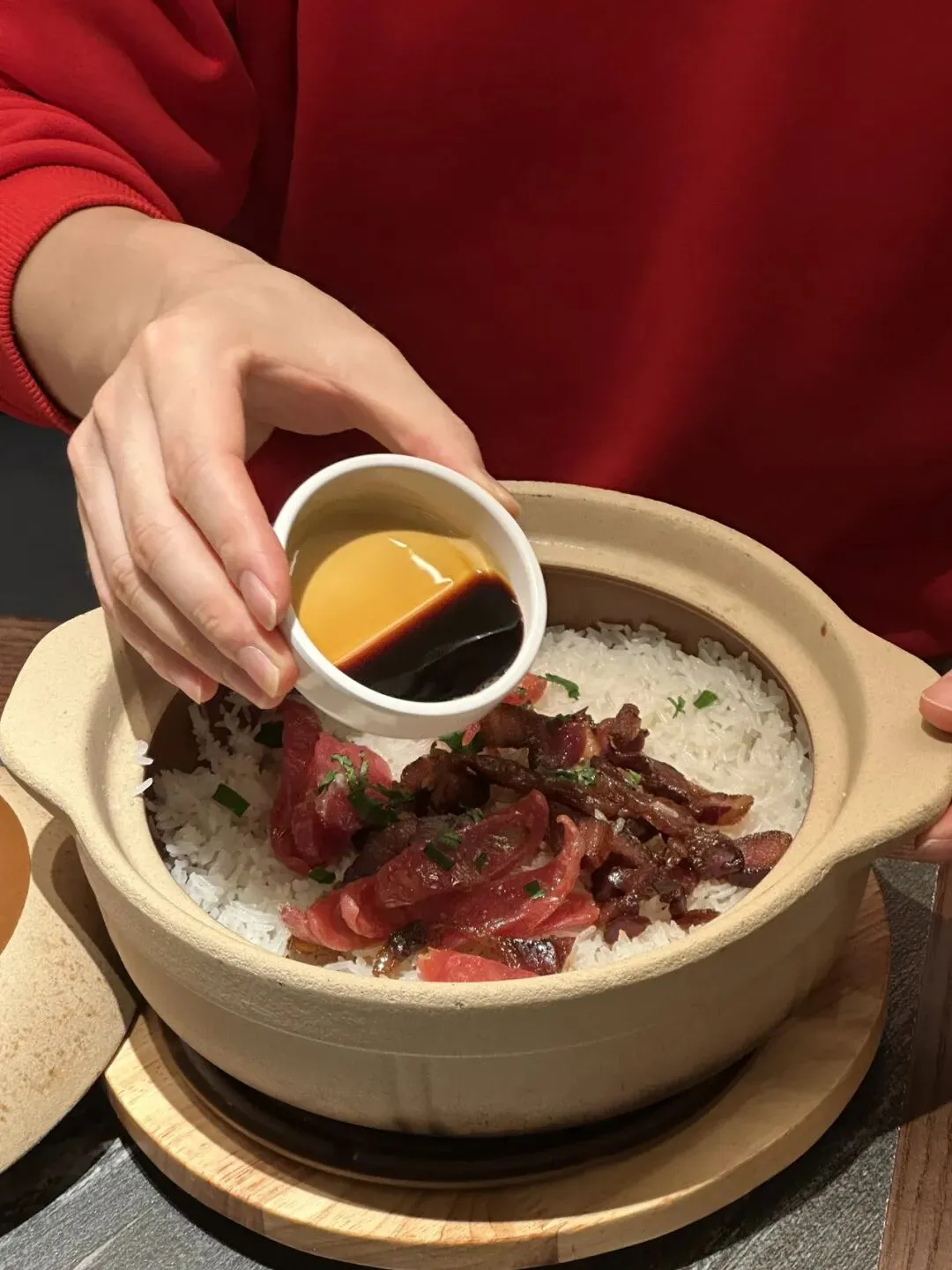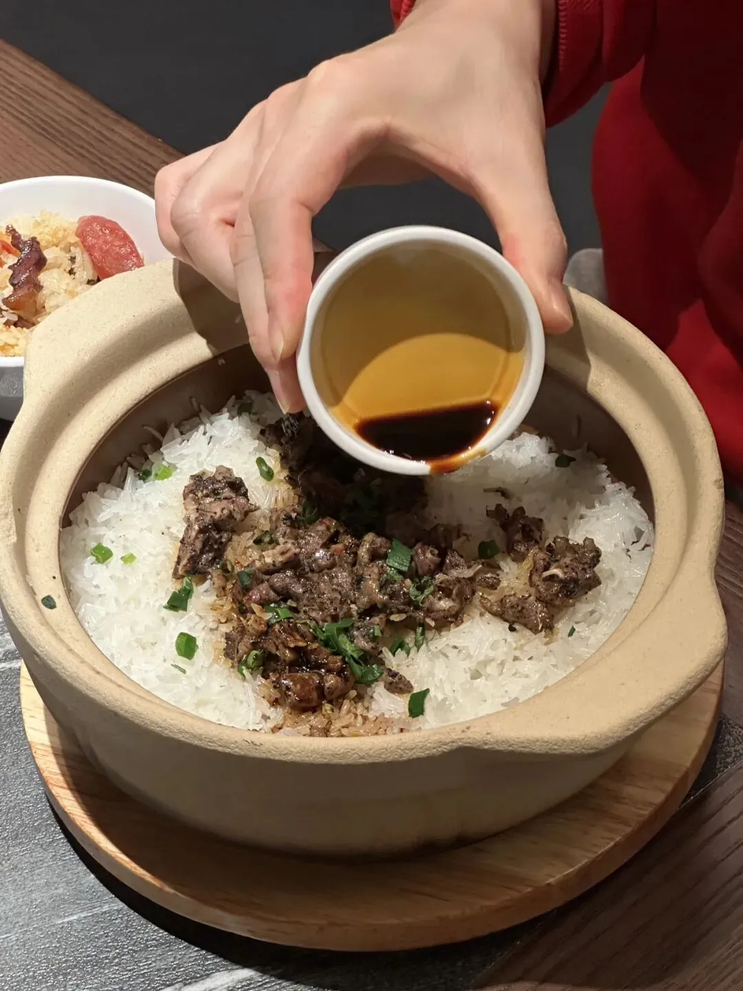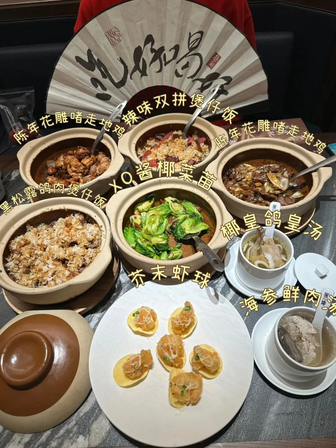 以前来都是纯吃点心,这次发现上了不少硬菜和煲仔饭,带爸妈来试过了,整理一份真实分享~陈年花雕啫走地鸡 开盖酒香就飘出来了,温润的陈年花雕味,走地鸡皮滑肉紧实,底下垫的姜葱也很入味~京葱生啫鲜牛匙柄口感比吊龙更香嫩!生啫的做法锁住了肉汁,上桌还在滋滋响~黑松露鸽肉煲仔饭这次最惊喜的新品!鸽肉嫩滑,黑松露的香气混着米饭的锅巴香,超爱锅底焦脆的锅巴~芥末虾球芥末味不会呛鼻子,虾球炸得外酥里弹,,也不会很甜腻,喜欢~XO酱椰菜苗、双拼腊味煲仔饭也都不错!春节带家人或朋友聚餐都很合适,有种"传统中国年"的踏实感~既能吃到传统广式味道,又有新品不用纠结去哪家了~