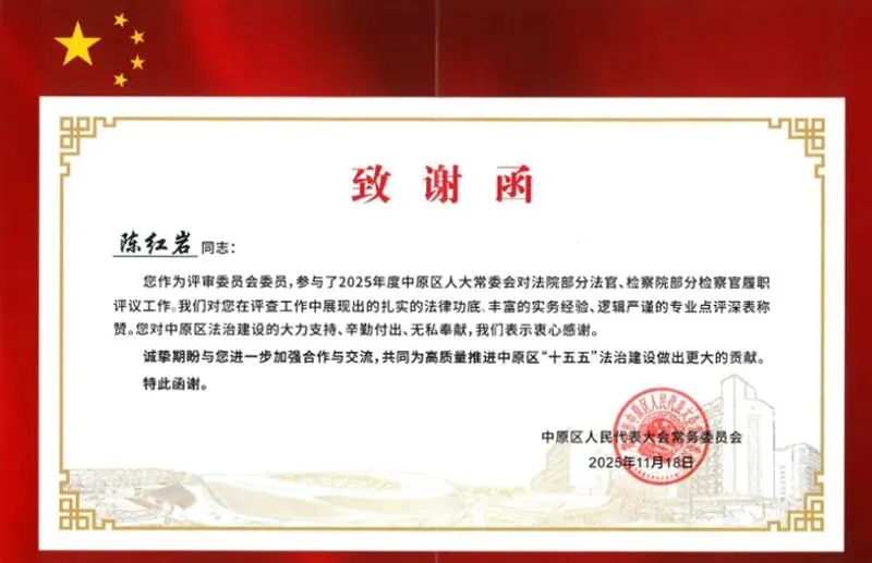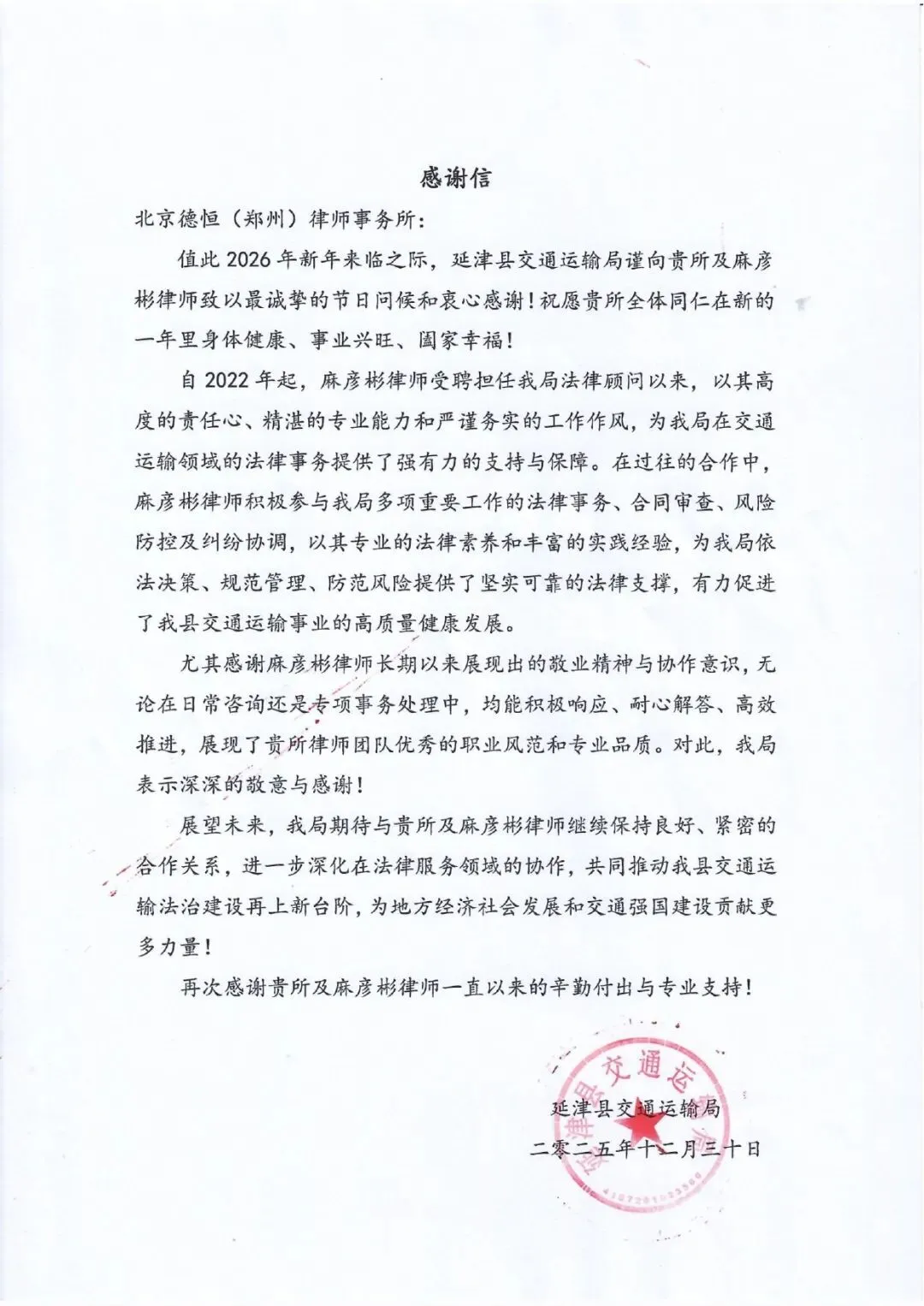 2025年,抵达成郑州德恒的一封封感谢信,是一个古老民族走向法治现代化的微型切片。从千年礼法求索,到十六字方略宏图,法治长河奔涌至今,终在个案的了结、眉宇的释然间,完成最朴素也最庄重的闭环。