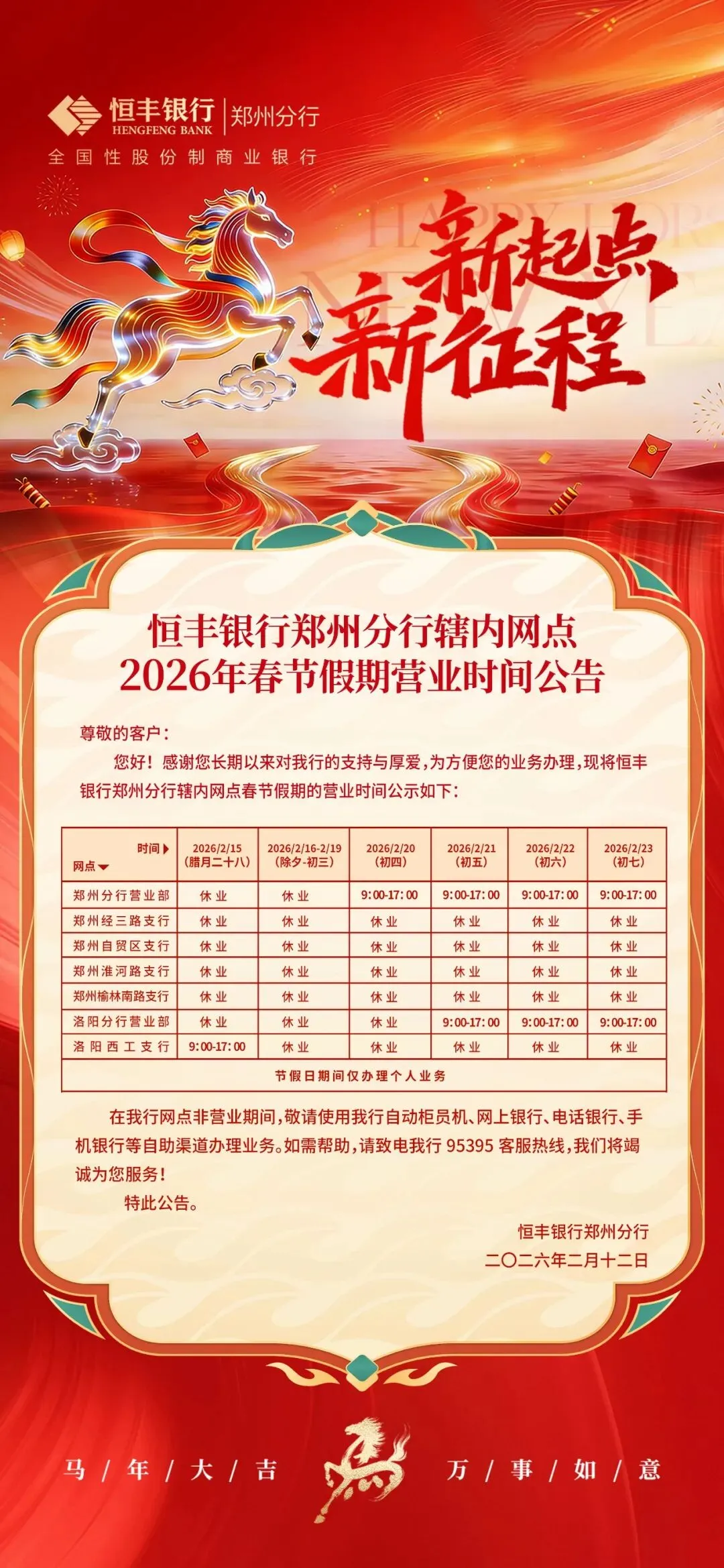 >恒丰银行郑州分行辖内网点2026年春节假期营业时间公告