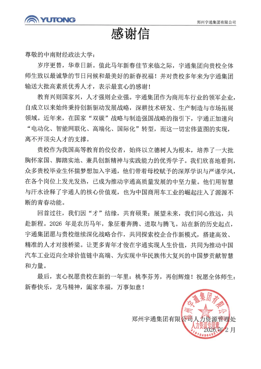 郑州宇通集团有限公司致中南财经政法大学感谢信