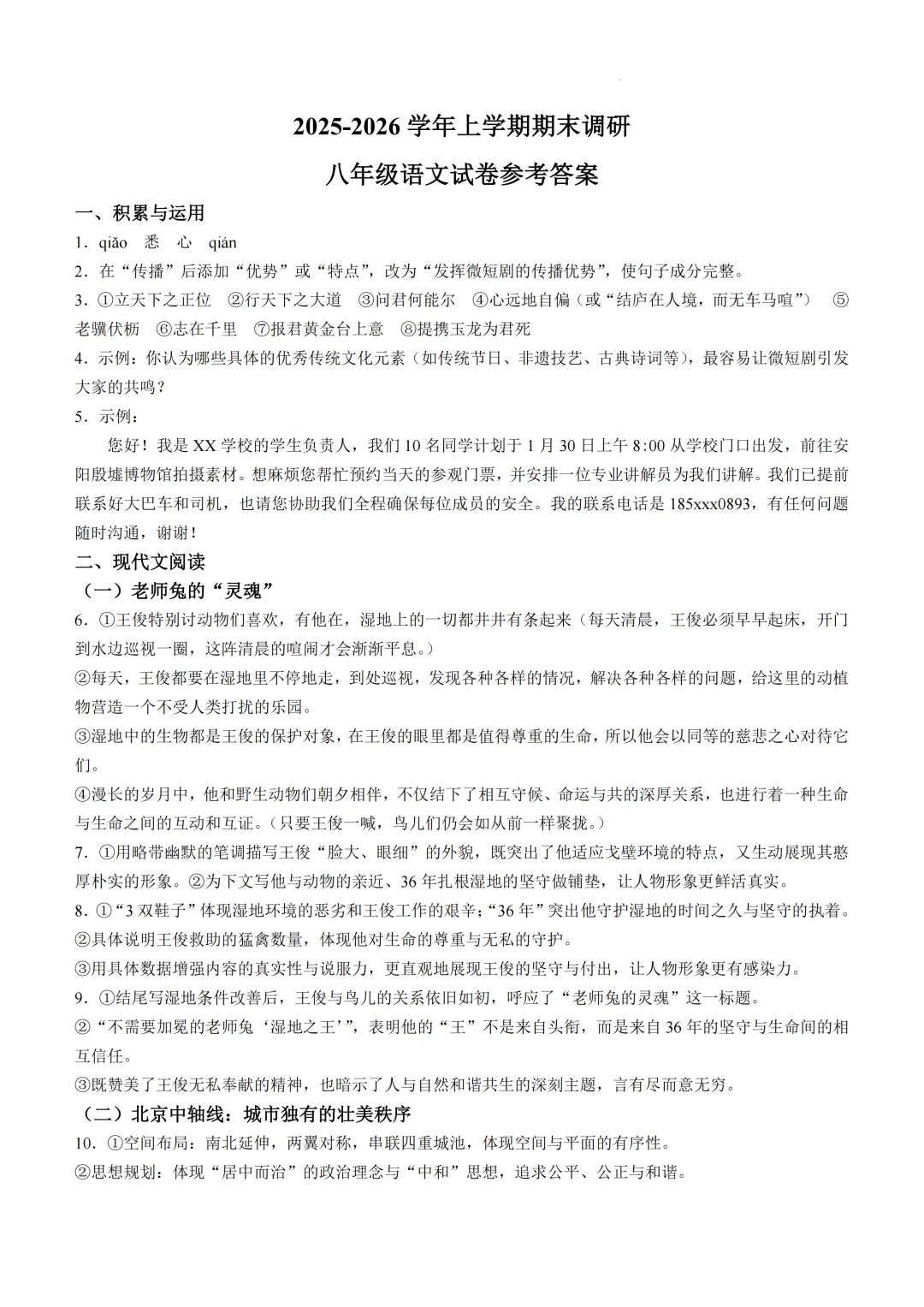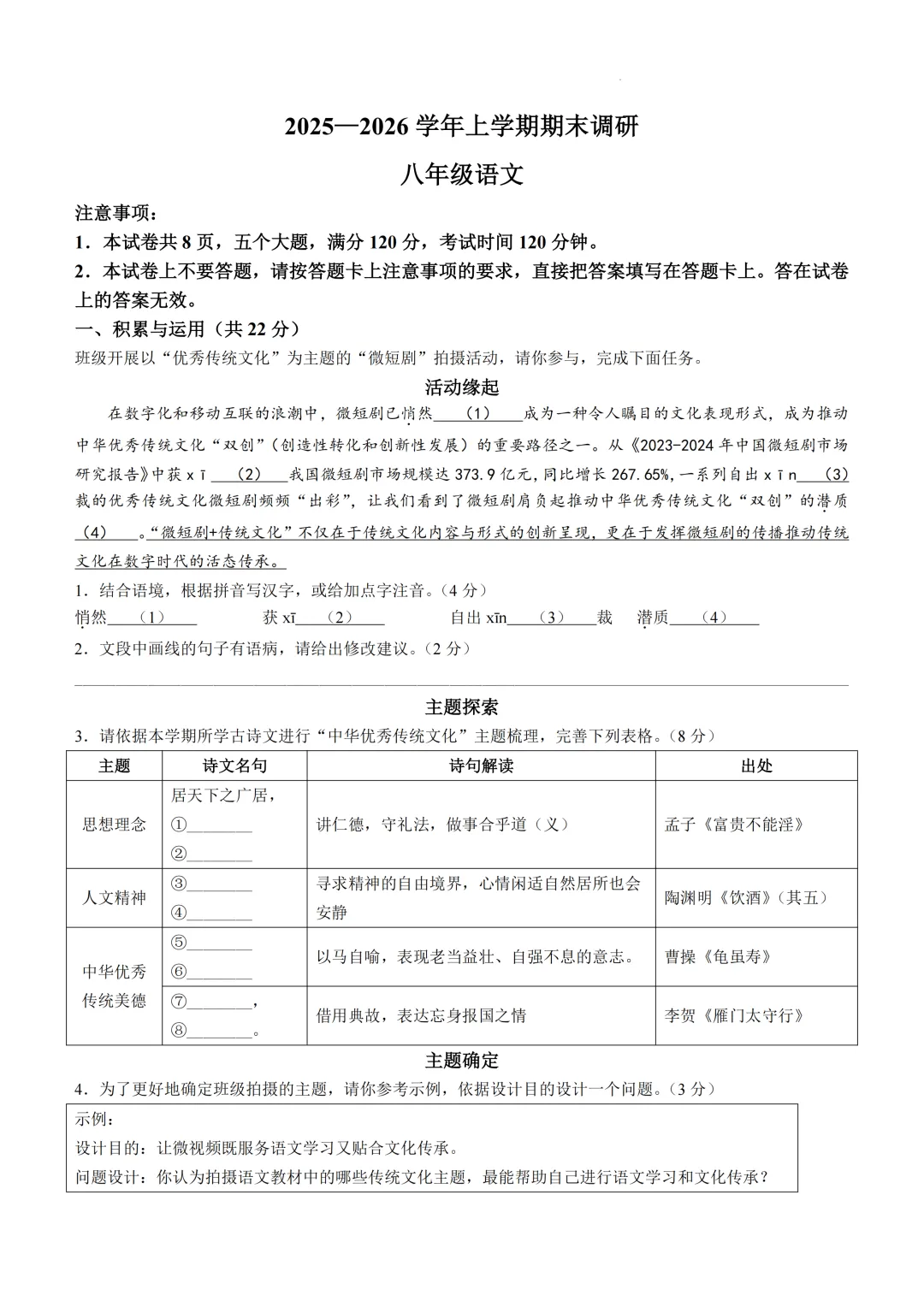本卷紧扣八年级语文课标,全面考查语言运用、文本解读、文化传承等核心内容。基础题如古诗文默写(第3题)和词语辨析(第1题)属易得分点;难点集中在文本分析(第6-9题需深度解读)和综合写作(第18题涉及创意表达),其中第18题'这不只是一个数字'写作对学生的情感体验与创新表达能力要求较高,体现语文核心素养的深度培养。<点击图片查看全卷>