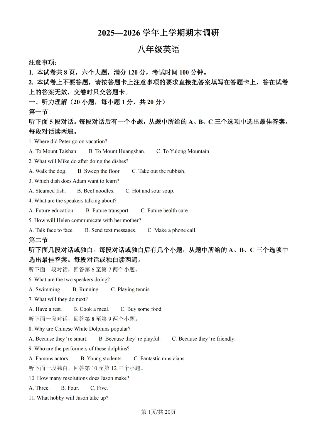 本卷紧扣八年级英语课标,全面考查听力理解、阅读理解、语言运用等核心内容。基础题如听力对话(第1-5题)和词汇填空(第36-45题)属易得分点;难点集中在语篇理解(第6-10题需逻辑推理)和综合写作(第56题涉及未来城市畅想),其中第56题未来城市写作对学生的语言表达与创新思维能力要求较高,体现英语核心素养的深度培养。<点击图片查看全卷>