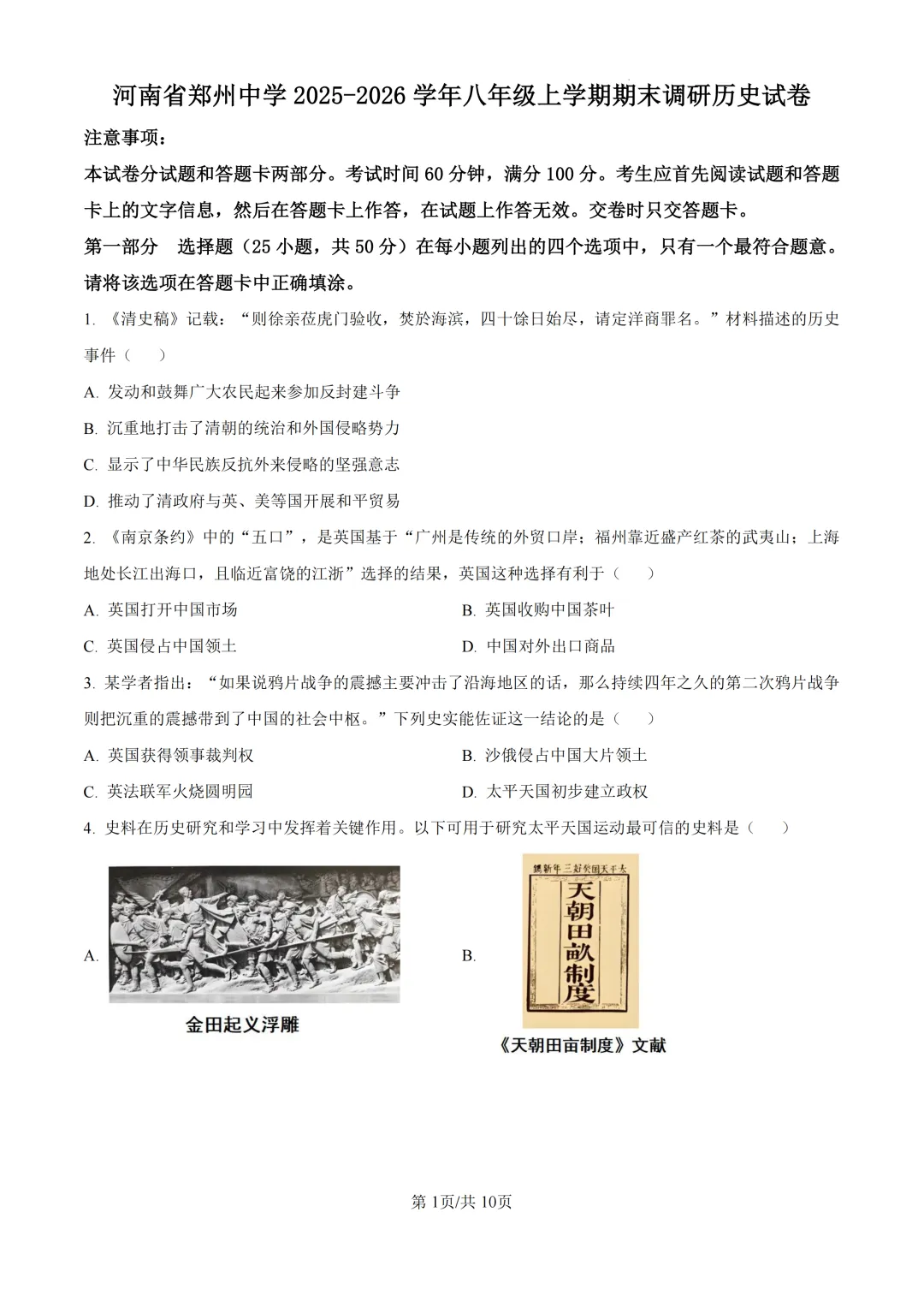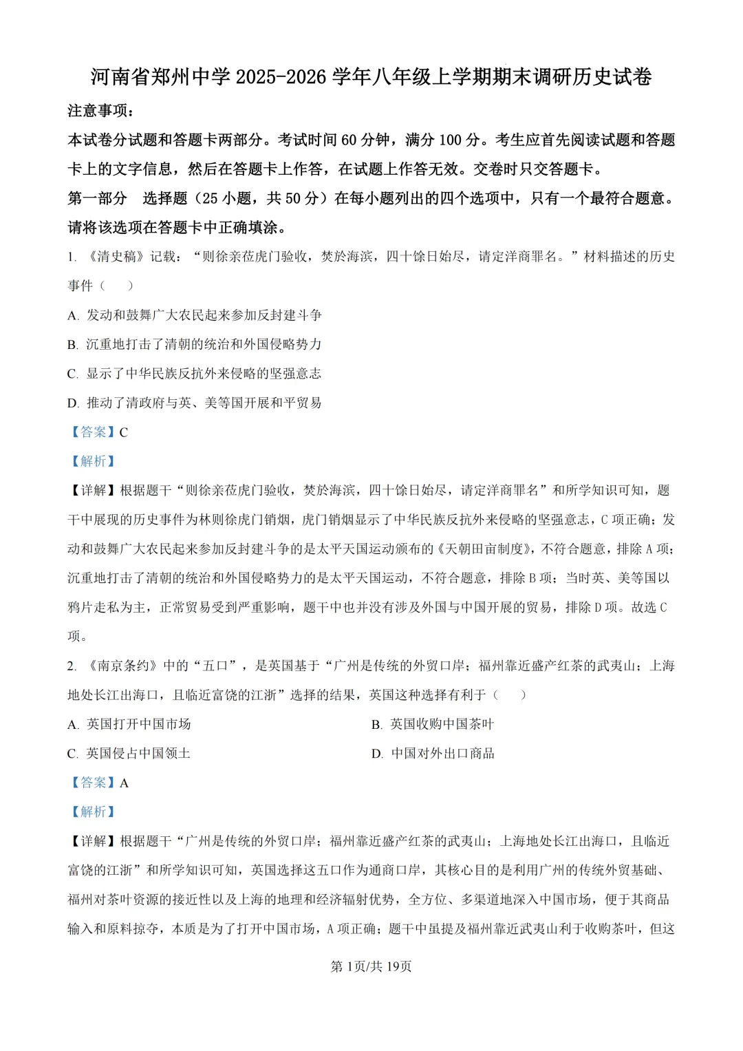 本卷紧扣八年级历史课标,全面考查鸦片战争、辛亥革命、抗日战争等核心内容。基础题如史实判断(第1-3题)和事件排序(第9-10题)属易得分点;难点集中在材料分析(第26-29题需史料解读)和综合论述(第29题涉及精神传承),其中第29题红歌精神解读对学生的历史理解与价值认同能力要求较高,体现历史核心素养的深度培养。<点击图片查看全卷>