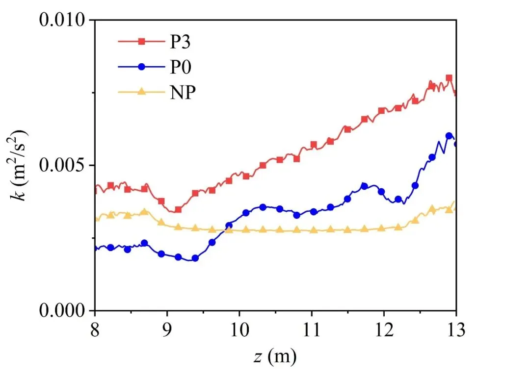 P3板下游湍动能峰值达无板工况的200%,且自板前缘起即维持120%以上水平,空间分布均匀;P0板前缘出现抑制区(降至70%),沿程呈现明显起伏变化。