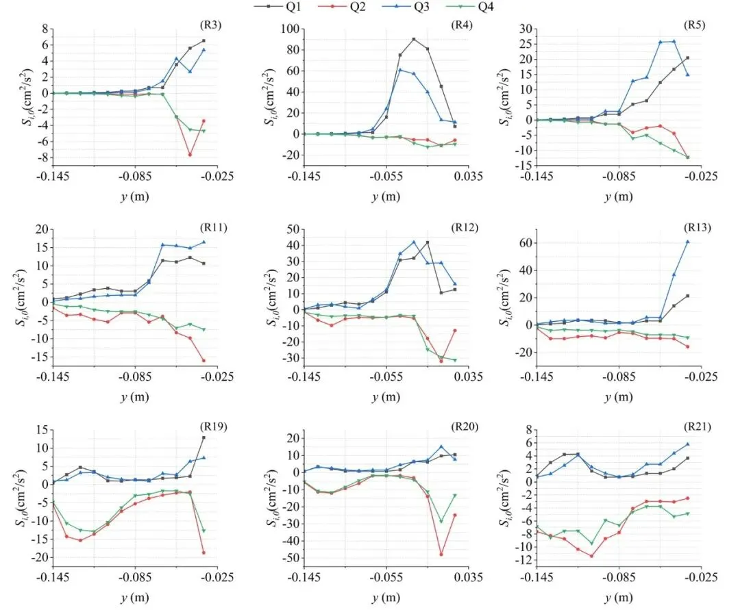 Fig. 2. Contribution of each flow quadrant to the Reynolds stress along vertical cross-sections that at three ridges in each of the upstream, midstream, and downstream segments of the sediment reduction plates for the P0 case.