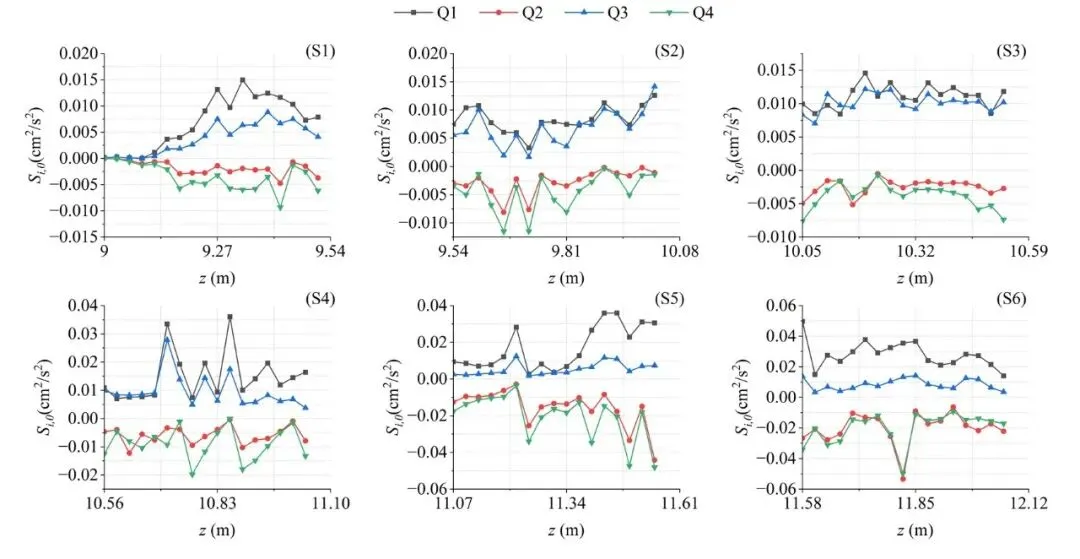P0板上游及中游脊区由外向/内向相互作用(Q1/Q3)主导,促进悬浮;中游槽底扫掠(Q4)成为唯一主导事件,产生局部强剪应力;下游近底区域则以喷射与扫掠(Q2/Q4)共同主导。P3板近底区域沿流向均由外向相互作用与扫掠(Q1/Q4)稳定主导,象限贡献幅值波动小,流态均匀。二者对比表明:P0通过间歇性强扫掠实现定点冲刷,但槽区应力衰减;P3则以持续的扫掠-外向耦合作用维持均匀悬浮。