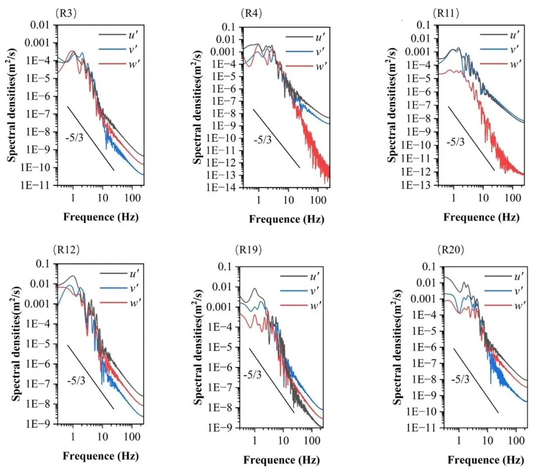 P0板能谱呈(Su' > Sv' > Sw'),流向脉动占优,垂向脉动最弱。P3板能谱呈(Su' > Sw'> Sv'),垂向脉动能量跃居第二,且高频段衰减更平缓。对比表明:P0板湍流能量集中于流向,利于产生强扫掠、实现定点冲刷;P3板则将更多能量分配至垂向脉动,更利于沉积物的持续悬浮。