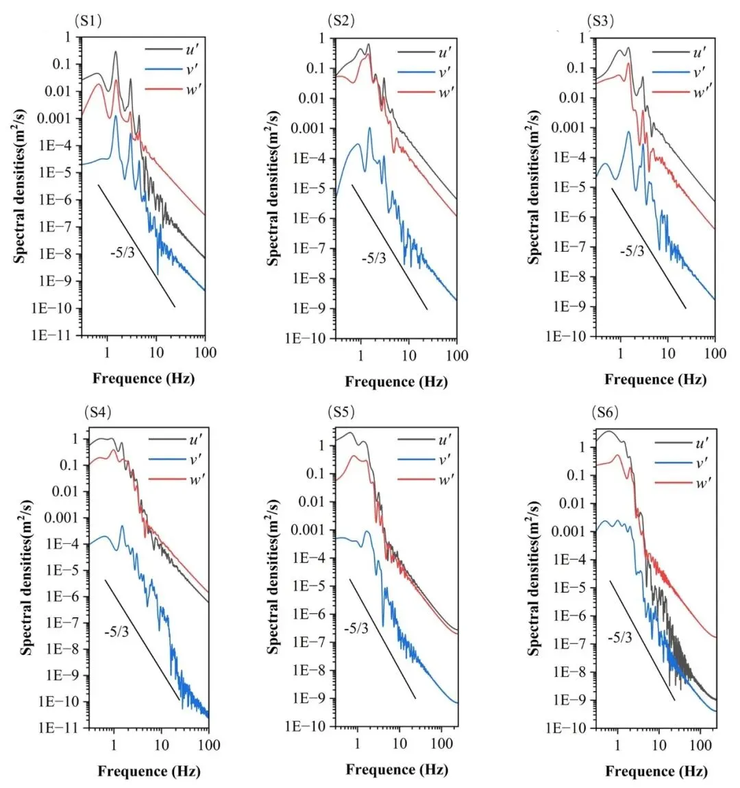 Fig. 4.Spectral densities of velocityalong the sediment reduction plate under P0 case.