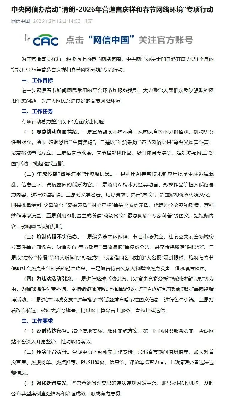 中央网信办:即日起,着力整治以“年货采购”等名义炫富斗富,炮制“父母偏心”“婆媳矛盾”博流量,AI生成“霸总爽剧”等问题。