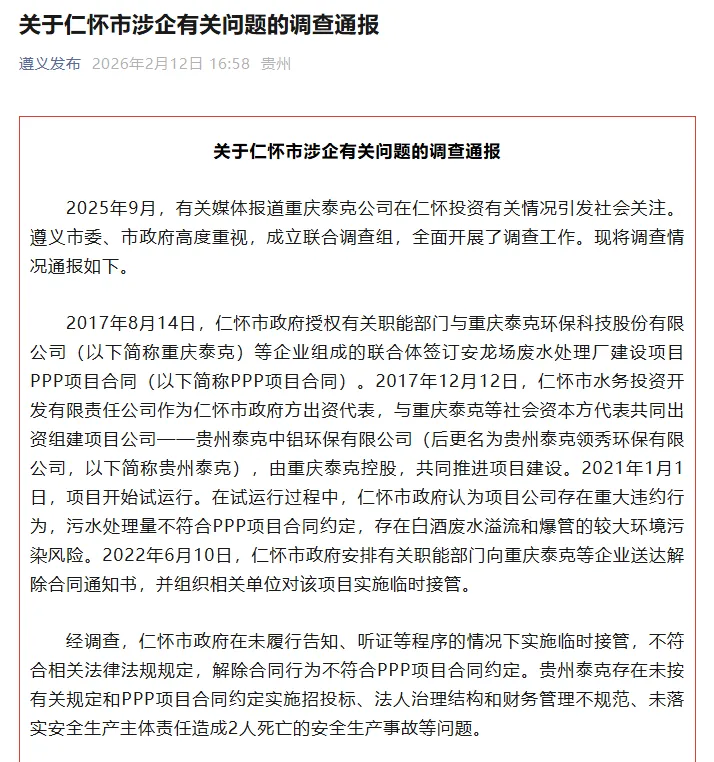 男子投资8亿在茅台镇建厂遭强行接管,贵州遵义12日发布调查通报:责成仁怀市对临时接管行为进行整改,对涉嫌违纪违法线索,已移交纪检监察机关。