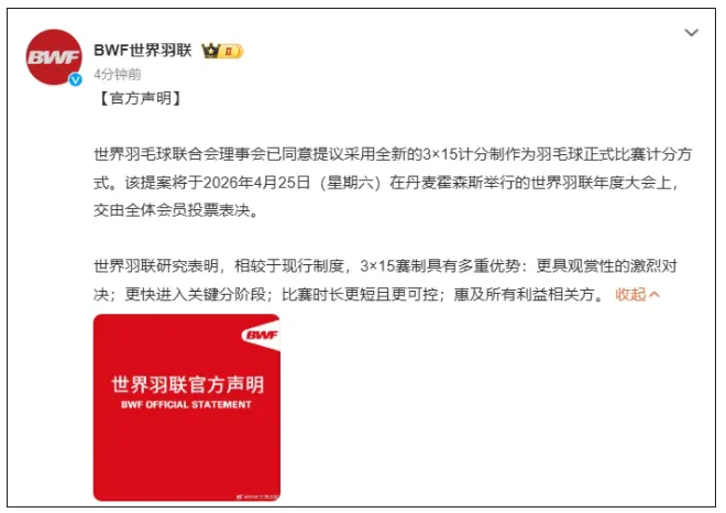 世界羽联官方宣布,世界羽毛球联合会理事会已同意提议采用全新的3×15计分制作为羽毛球正式比赛计分方式。