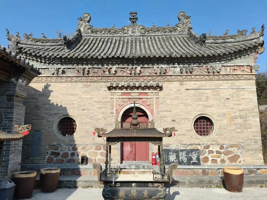 重阳观现存建筑为三清殿一座,道士房两座。大殿面阔三间,进深一间,单檐歇山顶,券拱式无梁殿建筑。