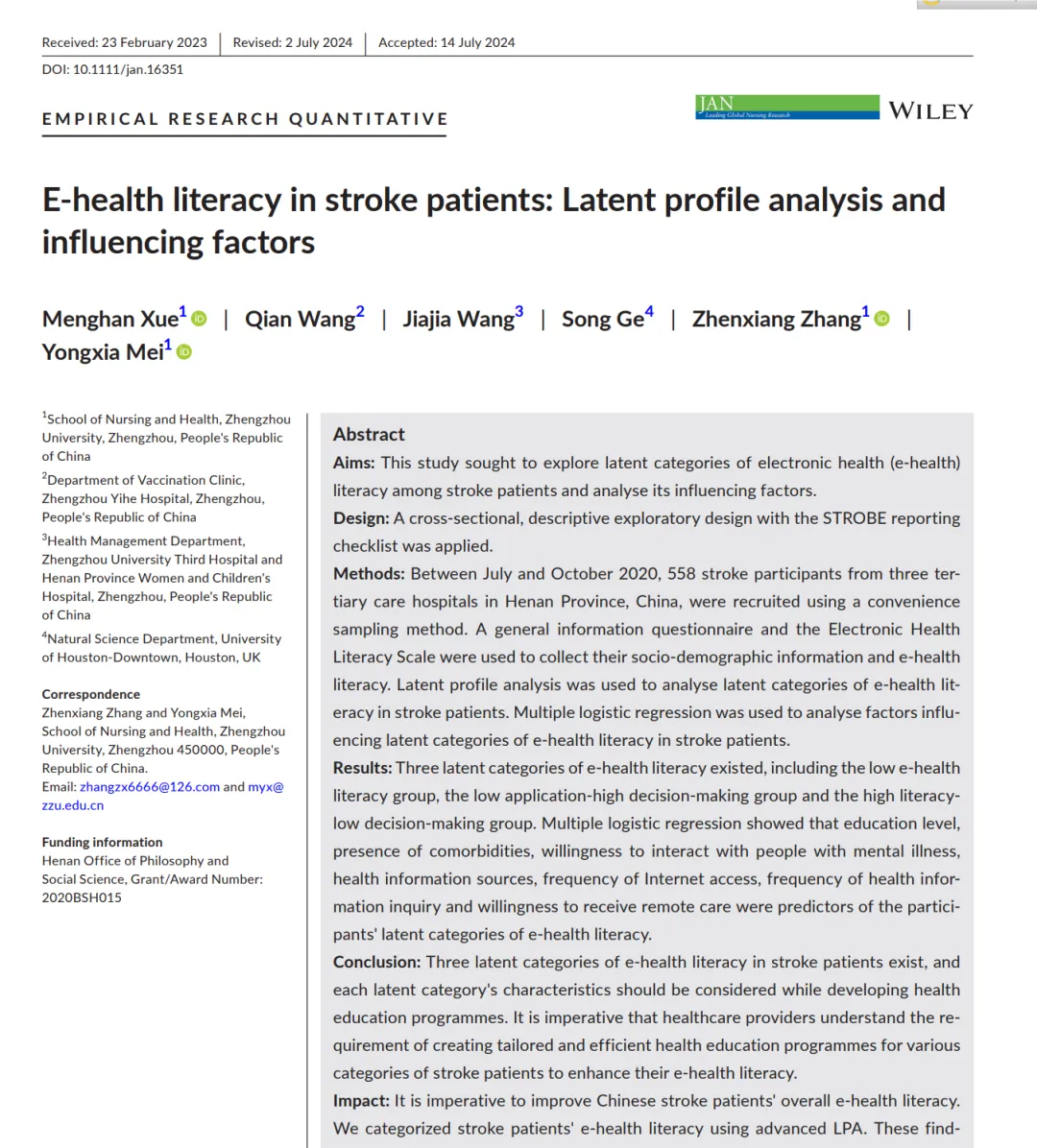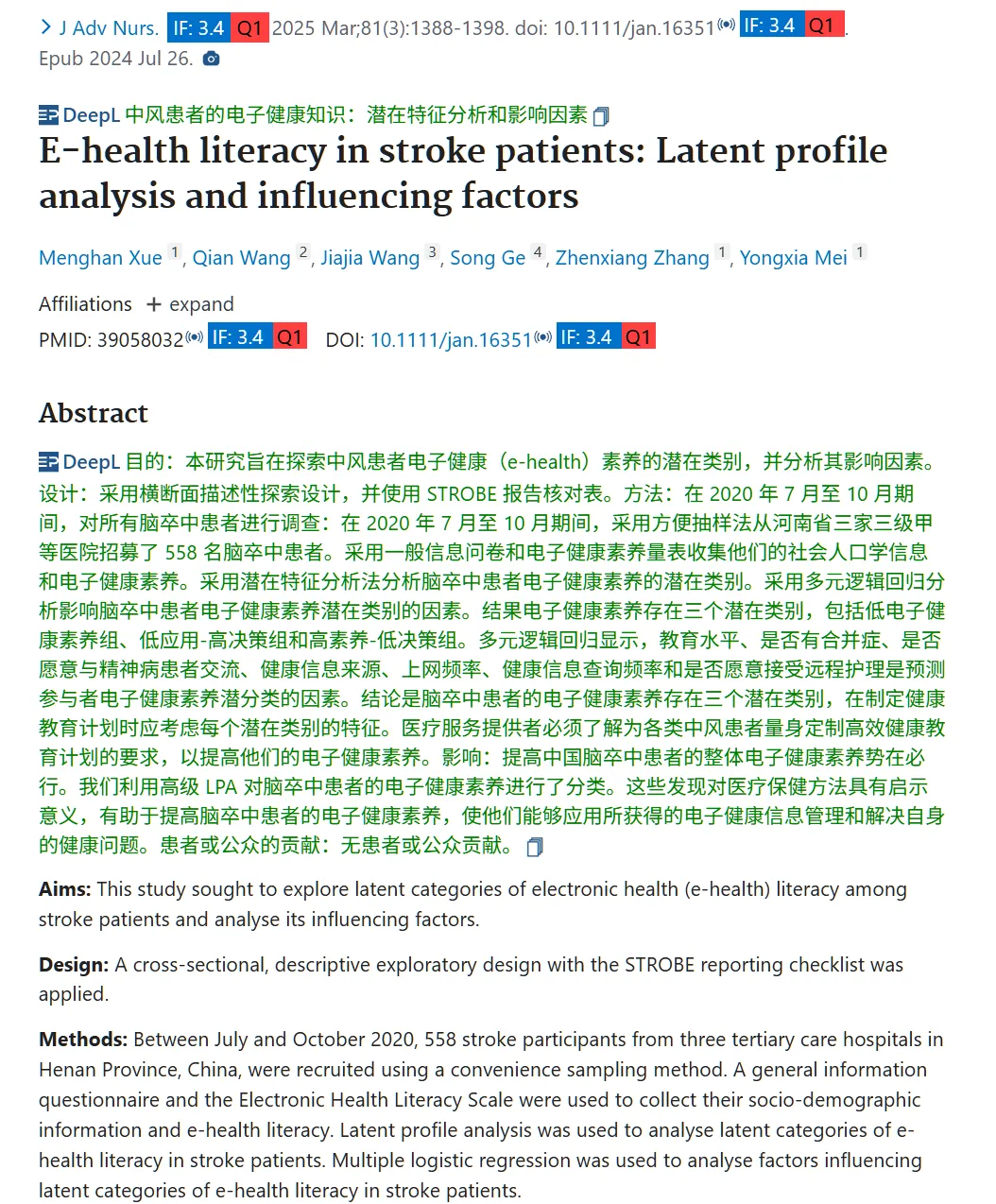 2025年3月在SCI杂志《J Adv Nurs.》上发表了题为《E-health literacy in stroke patients: Latent profile analysis and influencing factors》的文章。本研究旨在探索中风患者电子健康(e-health)素养的潜在类别,并分析其影响因素。通过对558名来自河南省三家三级甲等医院的中风患者进行问卷调查,结果显示存在三类电子健康素养:低素养组、低应用-高决策组和高素养-低决策组。多元逻辑回归分析结果表明,教育水平、合并症、健康信息获取方式和互联网使用频率等因素会影响患者的电子健康素养类别。研究强调在制定健康教育计划时需考虑不同类别的特点,呼吁医疗服务提供者针对不同中风患者量身定制高效的健康教育,以提高其电子健康素养。