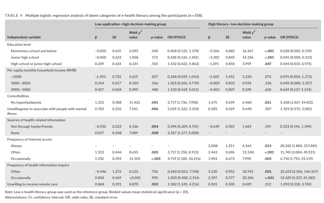 多元逻辑回归分析:评估不同因素(如教育水平、合并症状、健康信息来源等)对电子健康素养潜在分类的影响。