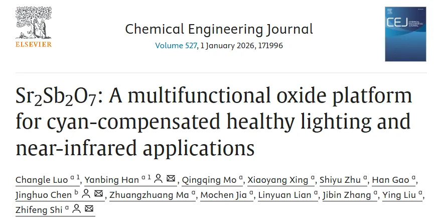 尽管白光发光二极管(WLEDs)在日常生活中应用广泛,但在健康照明的氰光谱区域仍面临严峻挑战。明亮条件下,WLEDs 众所周知的 “氰基缺口”(≈460–520 nm)使其与自然太阳光相比存在明显的颜色失真。昏暗环境中,人类暗视觉主要依赖峰值灵敏度约为 500 nm 的视杆细胞,而缺乏物相纯净、发光稳定的氰基荧光材料,严重阻碍了荧光转换型氰基 LED 的发展。本研究报道了一种物相纯净的无掺杂氰基发光荧光材料Sr2Sb2O7,其在 360 nm 紫外光激发下发射中心位于 500 nm 的氰光,可精准补偿 WLEDs 460–520 nm 光谱范围的 “氰基缺口”。仅以Sr2Sb2O7为荧光材料制备的氰基 LED,也与低光环境下人眼的暗适应特性相容。此外,Sr2Sb2O7具有优异的热稳定性和化学稳定性,在极端条件下仍能保持稳定的发光性能。通过稀土离子掺杂(Er3+/Yb3+/Nd3+),该材料在保留 500 nm 氰基发射的同时,实现了高效的近红外(NIR)发射,所制备的近红外 LED 器件在生物组织成像中展现出潜在应用价值。本研究为氰基补偿健康照明和近红外应用提供了一种基于Sr2Sb2O7的新型多功能氧化物平台策略。