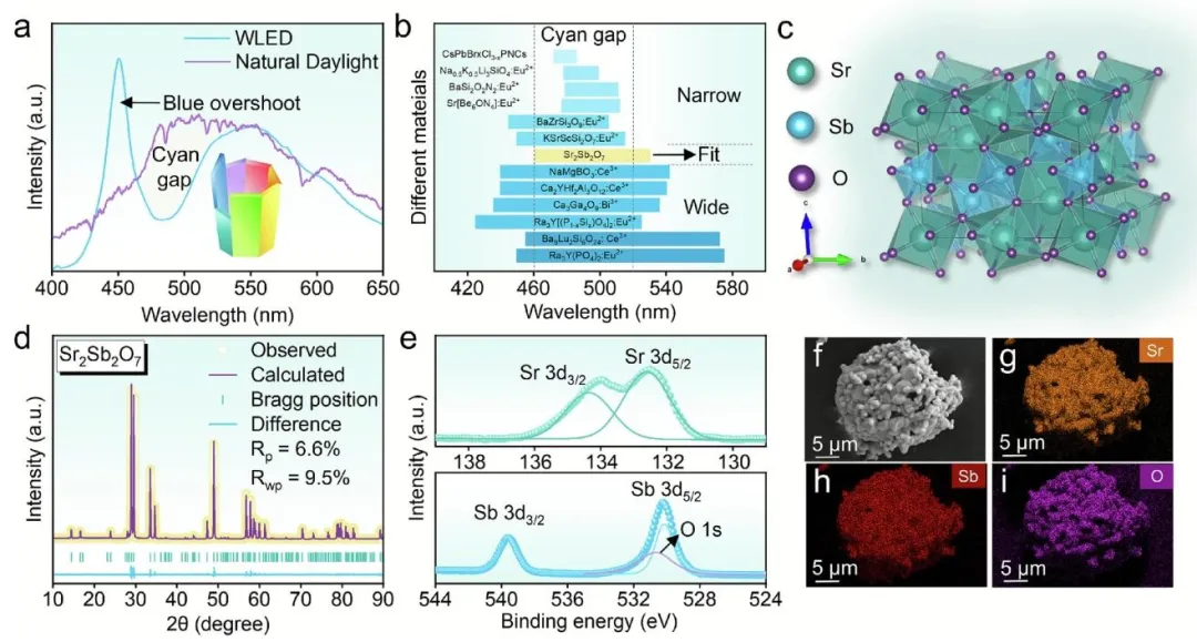 图 1、a)WLEDs 与自然太阳光的 “氰基缺口” 对比;b)不同材料的半高宽对比;c)Sr2Sb2O7晶体结构示意图;d)Sr2Sb2O7样品的 Rietveld XRD 精修结果;e)Sr2Sb2O7粉末的 XPS 结果;f-i)Sr2Sb2O7粉末的 EDS 元素 mapping 图。