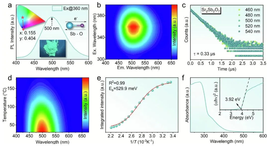 图 2、a)Sr2Sb2O7的光致发光光谱;b)Sr2Sb2O7在不同波长激发下的发射光谱;c)Sr2Sb2O7在不同发射波长下的 PL 寿命;d)Sr2Sb2O7在不同高温下的发射光谱;e)高温下 PL 强度与 1/T 的拟合曲线;f)漫反射法测得的Sr2Sb2O7吸收光谱,插图为 Tauc 图。