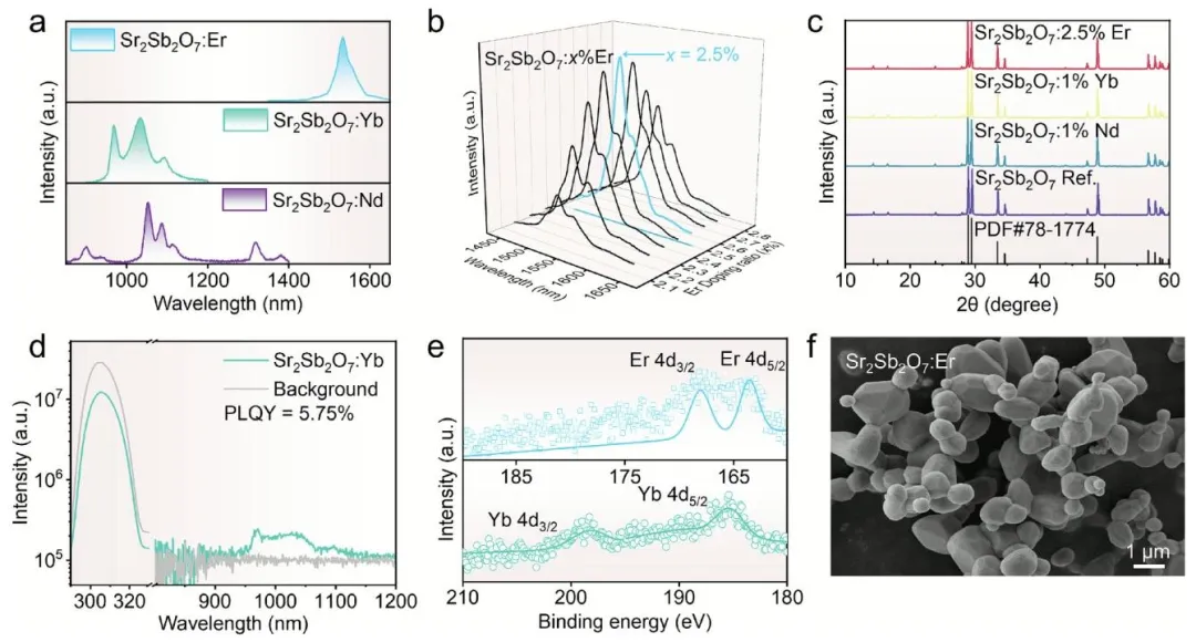 图 4、a)Sr2Sb2O7经Er3+、Yb3+、Nd3+掺杂后的近红外 PL 光谱;b)不同Er3+掺杂比例的Sr2Sb2O7近红外 PL 光谱;c)Sr2Sb2O7经Er3+、Yb3+、Nd3+掺杂后的 XRD 结果;d)Yb 的近红外 PLQY 结果;e)Sr2Sb2O7经Er3+、Yb3+掺杂后的 XPS 结果;f)Sr2Sb2O7经Er3+掺杂后的 SEM 结果。