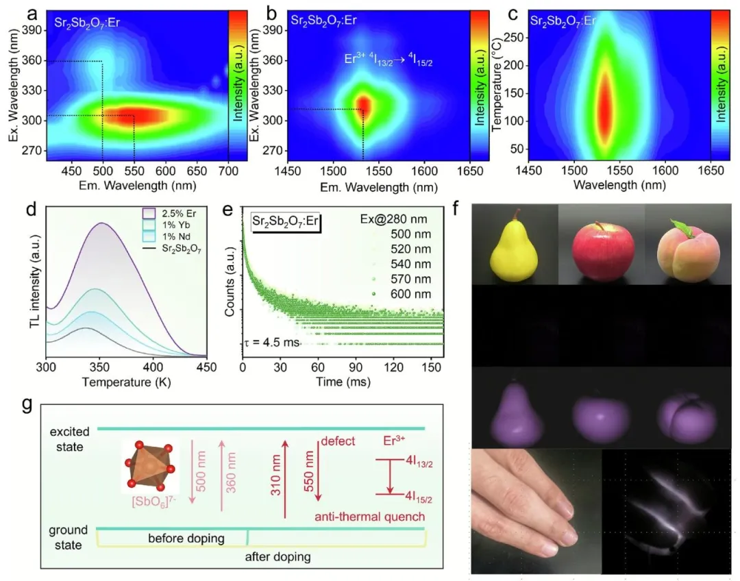 图 5、a)Sr2Sb2O7:Er3+在不同波长激发下的发射光谱;b)Sr2Sb2O7:Er3+在不同波长激发下的近红外发射光谱;c)Sr2Sb2O7:Er3+在不同高温下的近红外发射光谱;d)Sr2Sb2O7经Er3+、Yb3+、Nd3+掺杂后的 TL 结果;e)Sr2Sb2O7:Er3+在 280 nm 激发下的 PL 寿命;f)近红外 LED 在夜间照明和生物组织穿透中的应用;g)Er3+掺杂导致发光变化的机制示意图。