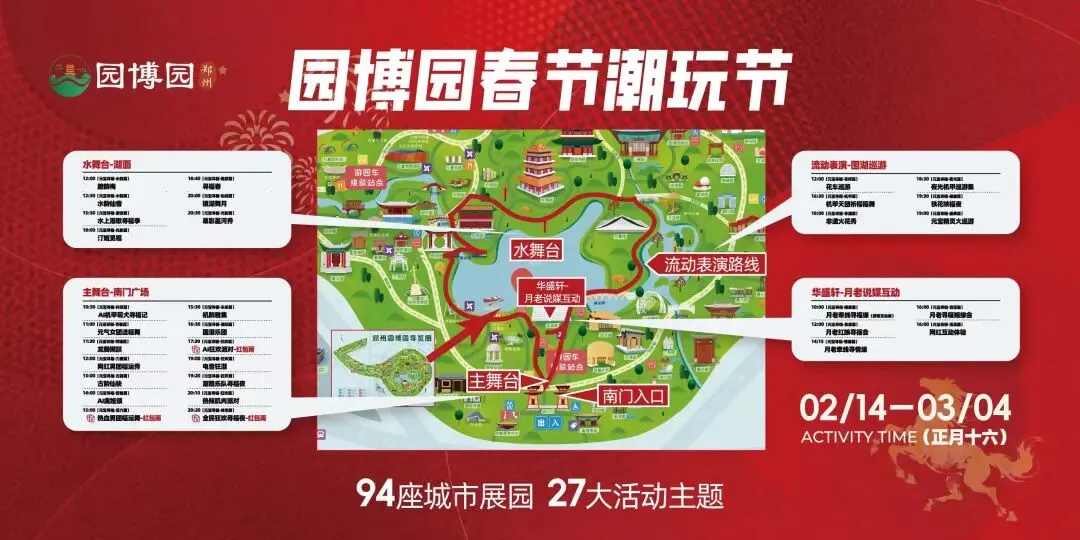 春节想解锁“国潮+游玩”的双重快乐?不必自驾堵高速,2026马年新春,郑州园博园直接把年味玩出新高度——西游师徒陪你巡游、电音炸场燃爆初一、非遗铁花惊艳夜空,27大主题活动轮番上演,94座城市展园一天逛不完!这份不踩坑攻略,收藏好就出发。