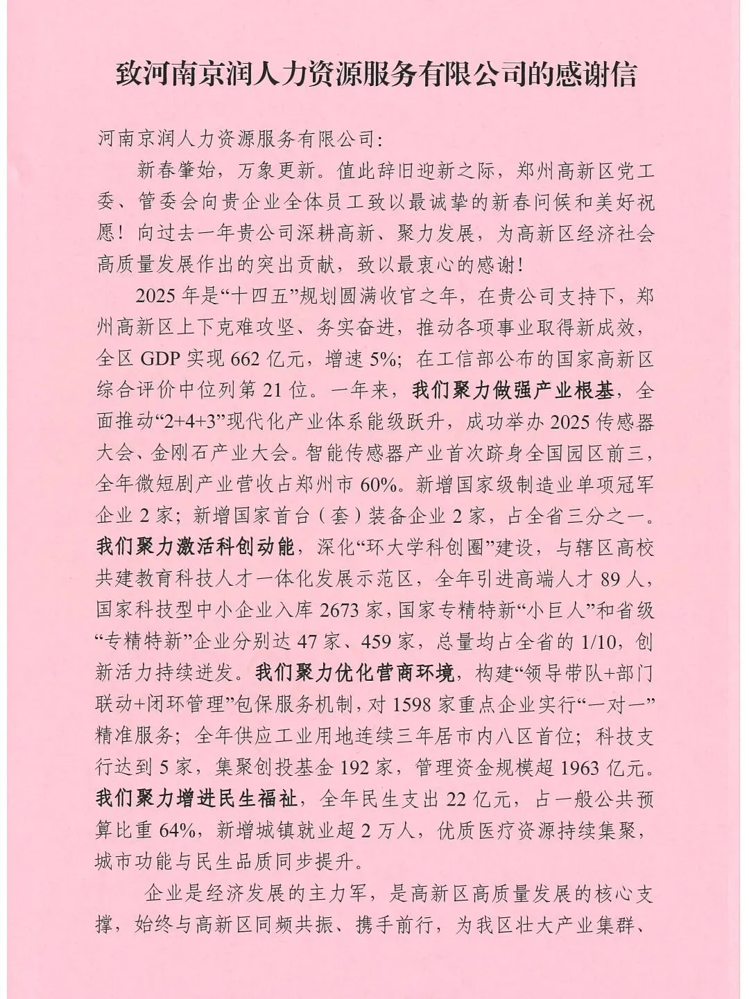 感谢信指出,2025年,郑州高新区“2+4+3”现代化产业体系加速构建,智能传感器、金刚石产业、微短剧等重点领域蓬勃起势。全区GDP突破662亿元,增速达5%,综合评价位列国家高新区第21位;新增国家级制造业单项冠军企业2家、国家首台(套)装备企业2家;国家专精特新“小巨人”企业达47家,省级专精特新企业达459家,总量均占全省十分之一。这一系列成绩的取得,是包括河南京润人力在内的广大企业与高新区同心同向、合力共为的生动见证。