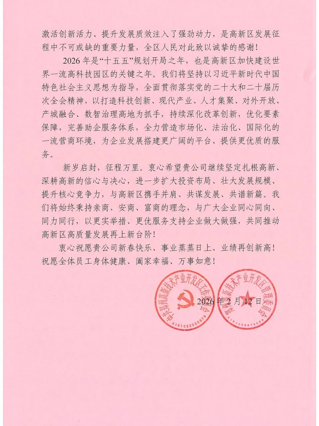 信中,高新区对我司过去一年扎根高新、服务发展、助力人才集聚所作出的积极贡献给予高度评价,并向全体员工致以诚挚的新春问候与美好祝福。