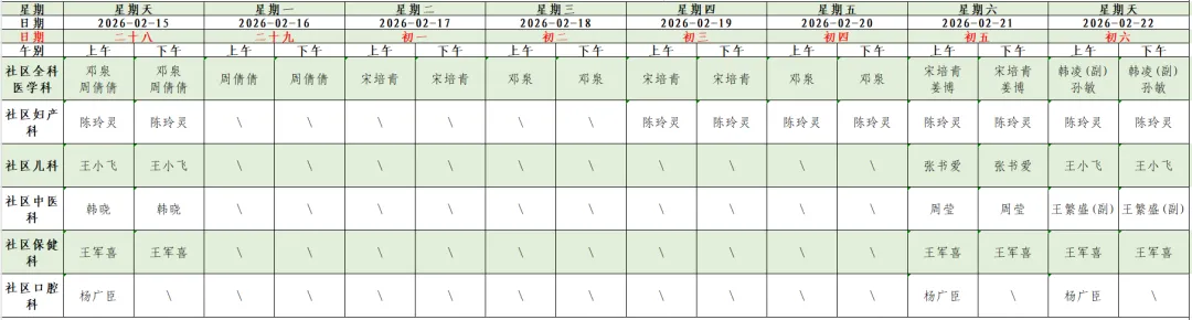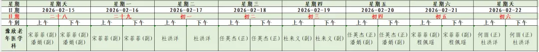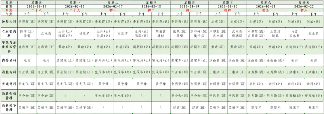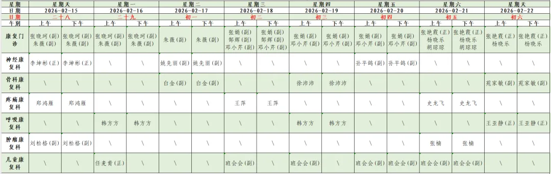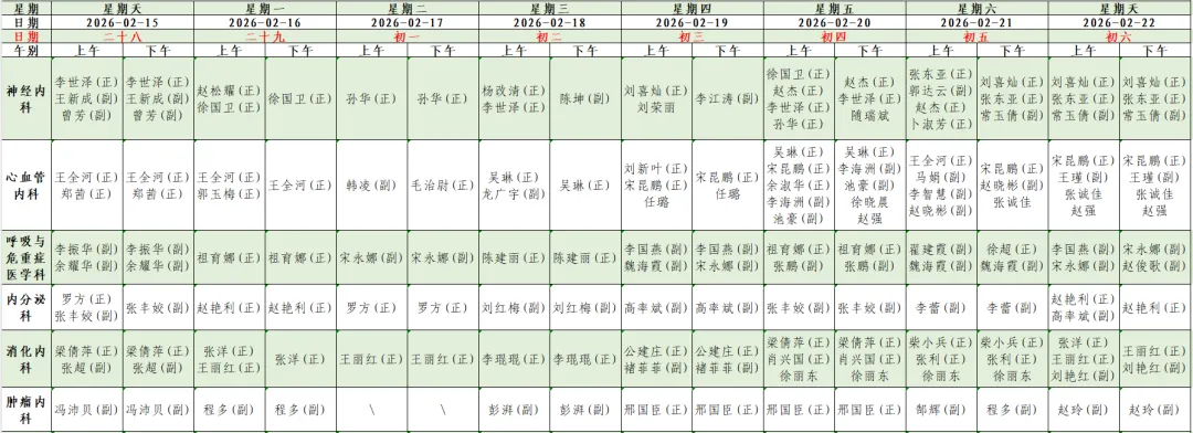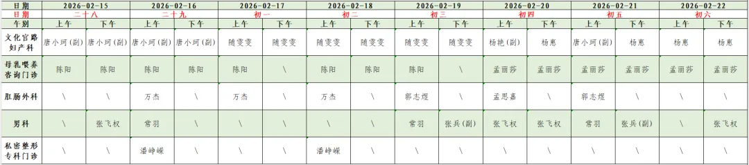为方便您提前了解我院门诊各科医生出诊信息,现将我院春节假期(2月15日-2月22日)门诊坐诊信息公示如下。您可通过我院互联网医院、支付宝生活号/小程序、抖音小程序、官方网站及合作平台预约挂号。如因工作调整,以当日实际出诊医师为准。