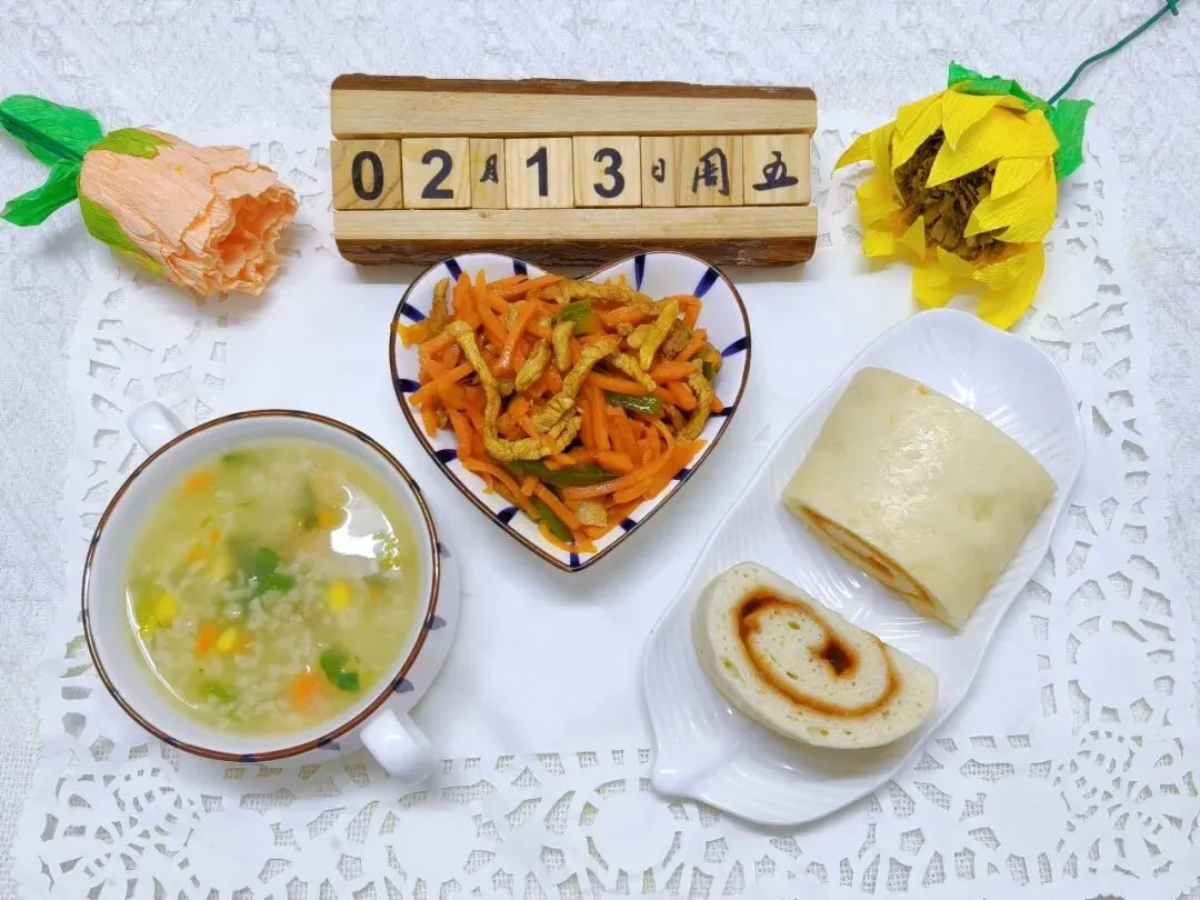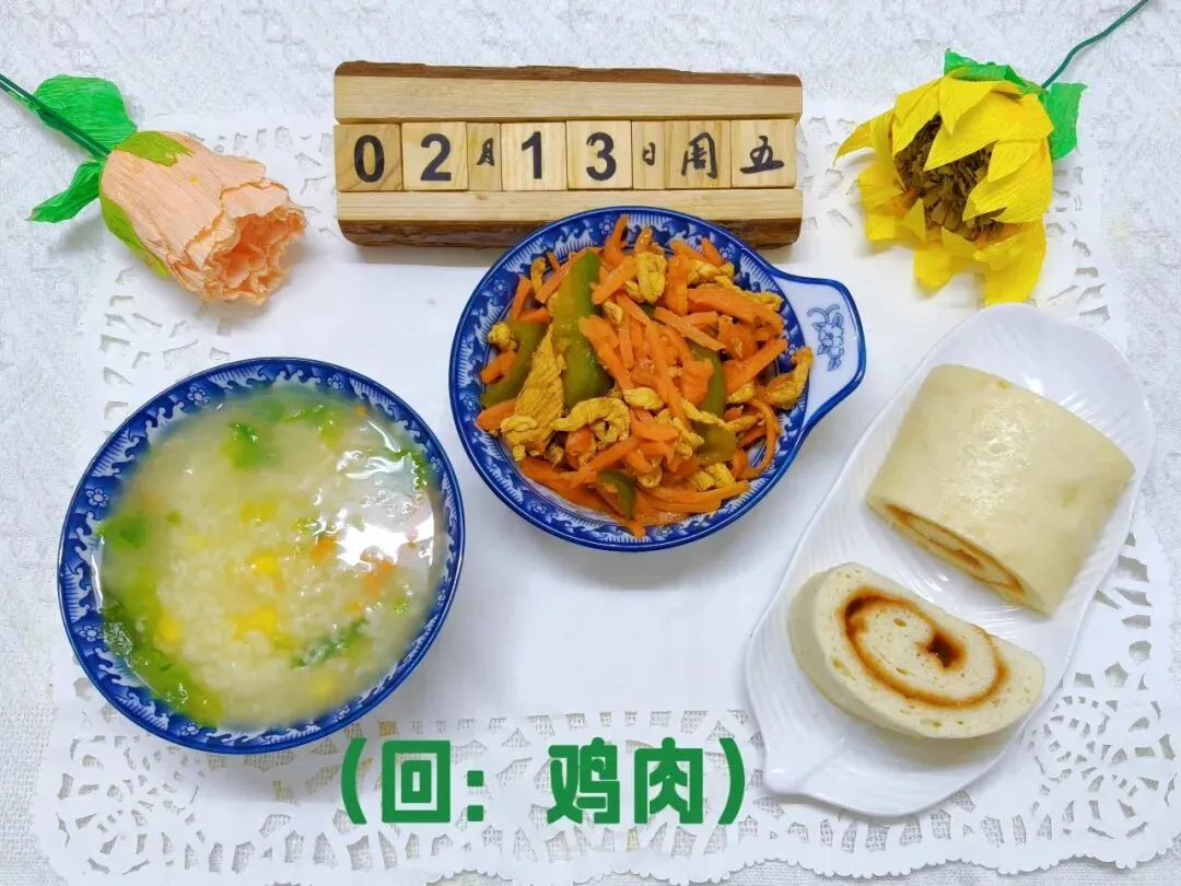 胡萝卜炒肉丝(回:鸡肉)、山楂卷、田园蔬菜粥