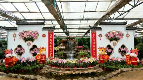 徽派白墙作纸,百合花枝为墨。古典花窗探出簇簇芬芳,假山流水叮咚和鸣。一侧是传统雕饰的红火年味,一侧是现代园艺的清雅生姿——新春第一眼,便是画里江南。