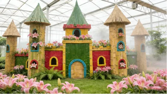 竹子搭成童话城堡,斑斓色彩披上梦幻外衣。窗棂檐角缀满百合,城堡四周汇成粉色花海。风过处,花香如蜜;光落时,花影如诗。孩子的笑、恋人的手,都会在这里停留。