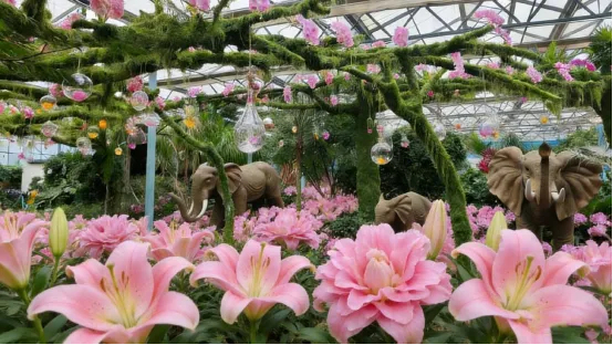 苔藓覆盖的树木搭成林间穹顶,蝴蝶兰攀附其上,玻璃瓶垂挂其间。大象雕塑悠然立于花海,寓意“太平有象”。林下百合层层绽放,恍若童话秘境。